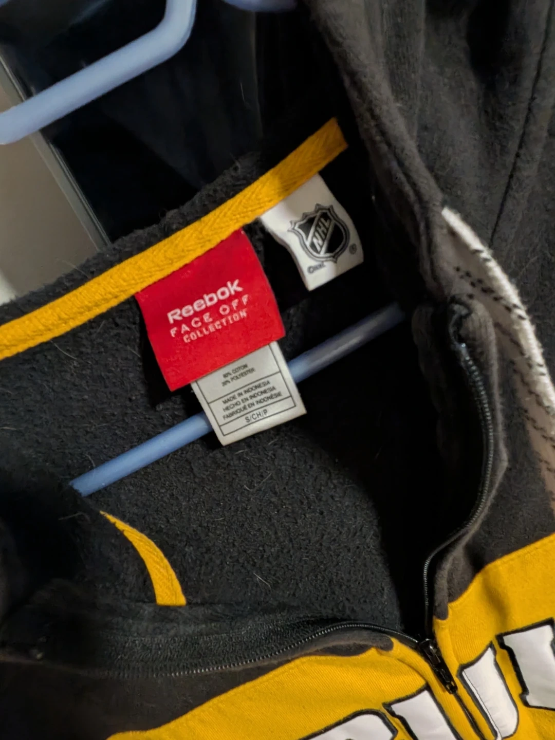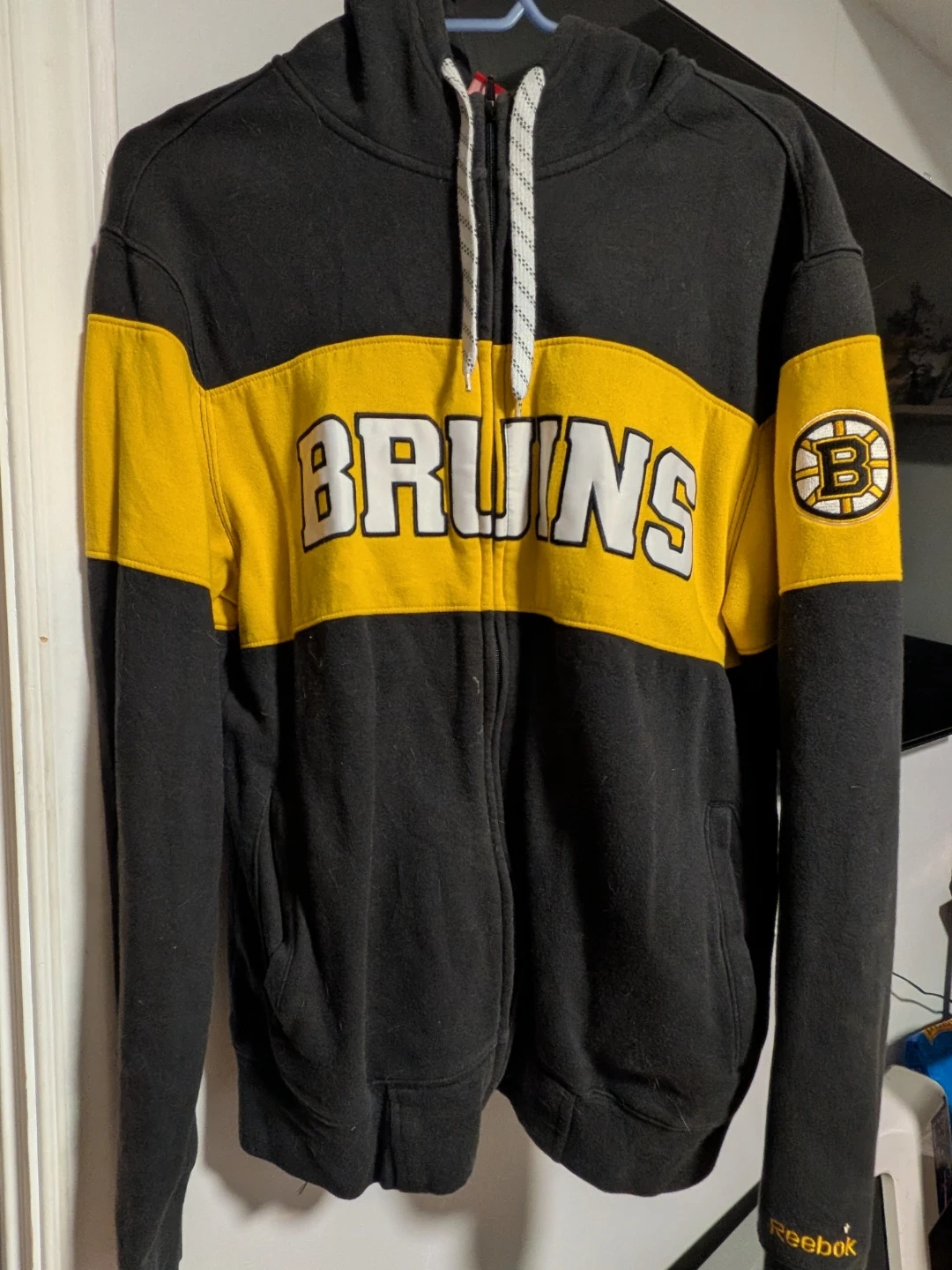 Selling a Reebok Bruins hoodie in size small. It features a black and gold design with the Bruins logo. The hoodie is in good condition and perfect for any Bruins fan! Pet friendly, smoke free home. Pick up only.