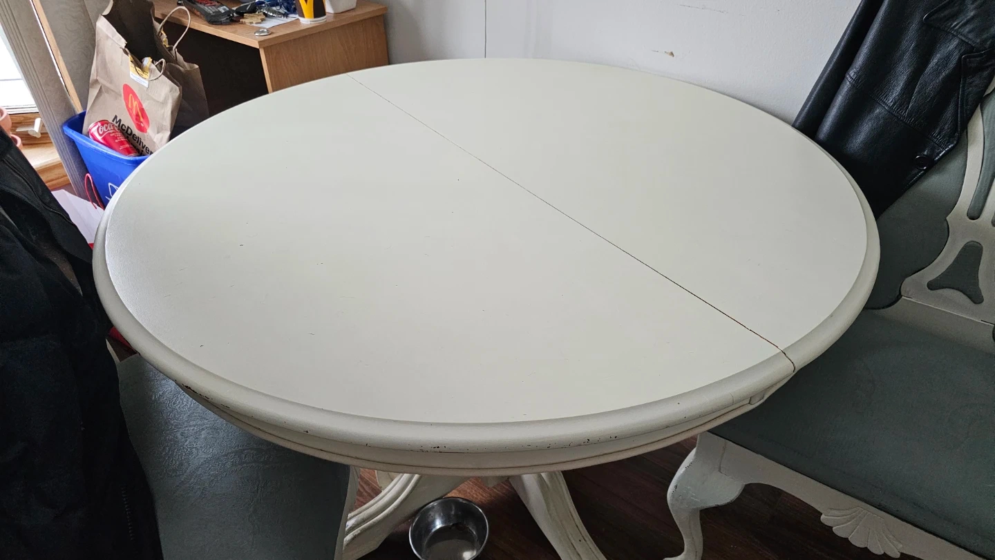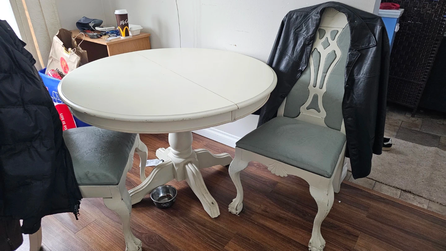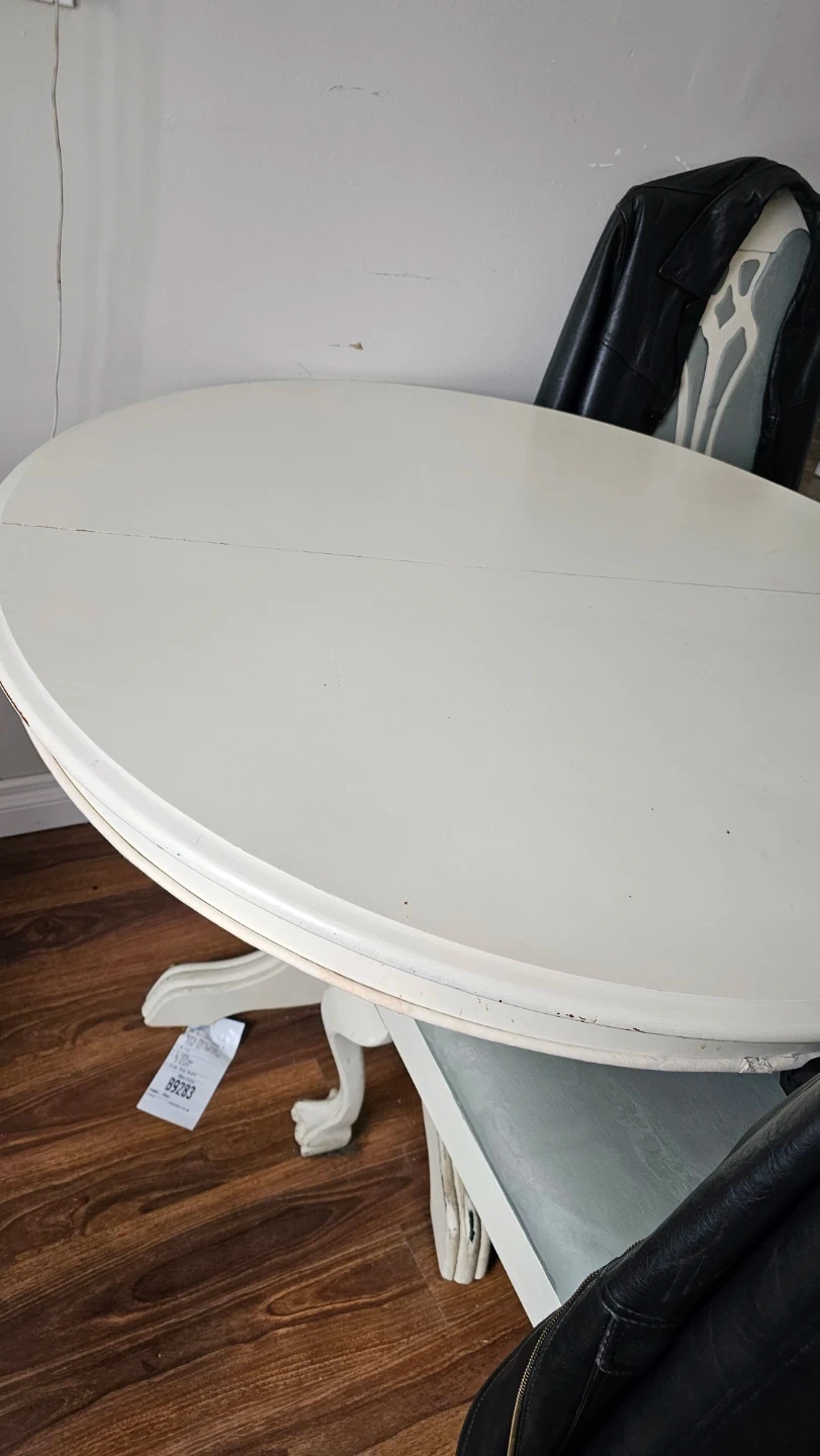 This is a charming white round pedestal dining table. It features a classic design with a sturdy pedestal base. It's well-suited for small to medium dining areas or breakfast nooks. It comes with four chairs