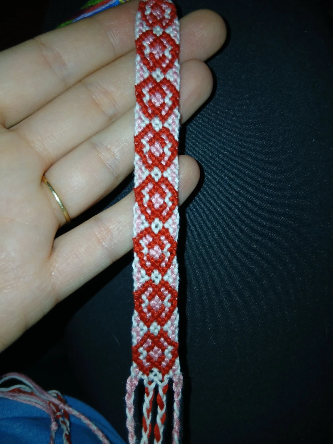 This is a handmade bracelet with a diamond pattern. It's made with red, white, and pink threads. The braided ends are also red and white. It's a lovely accessory for anyone!