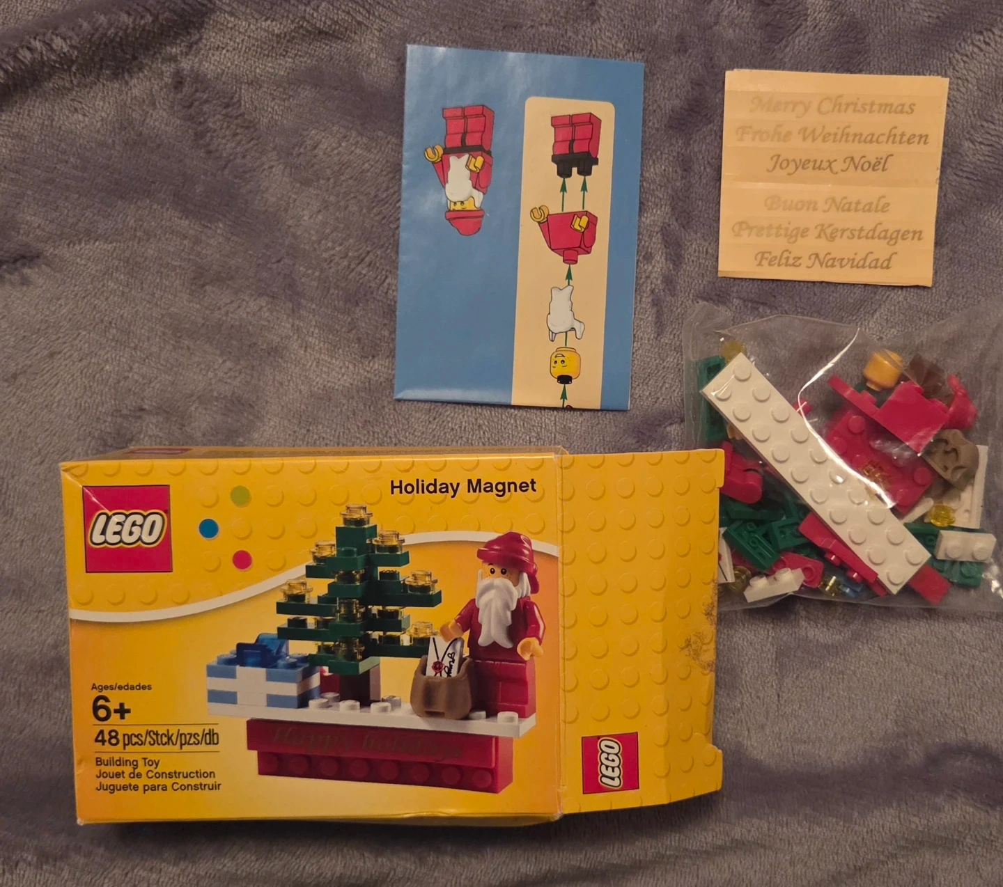 LEGO Holiday Magnet building toy. It's a set with 48 pieces for ages 6 and up. Includes instructions and a festive holiday message.