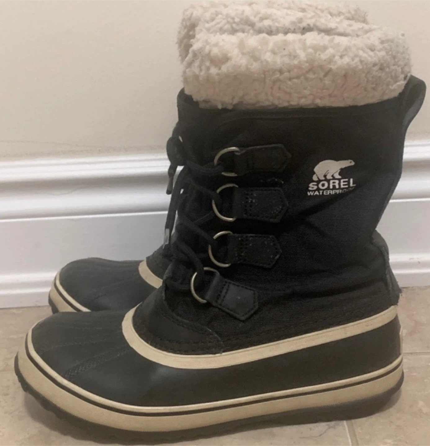 Sorel waterproof winter boots with a cozy fleece lining. Features a black upper with a cream-coloured sole and trim. Lace-up front for a secure fit.