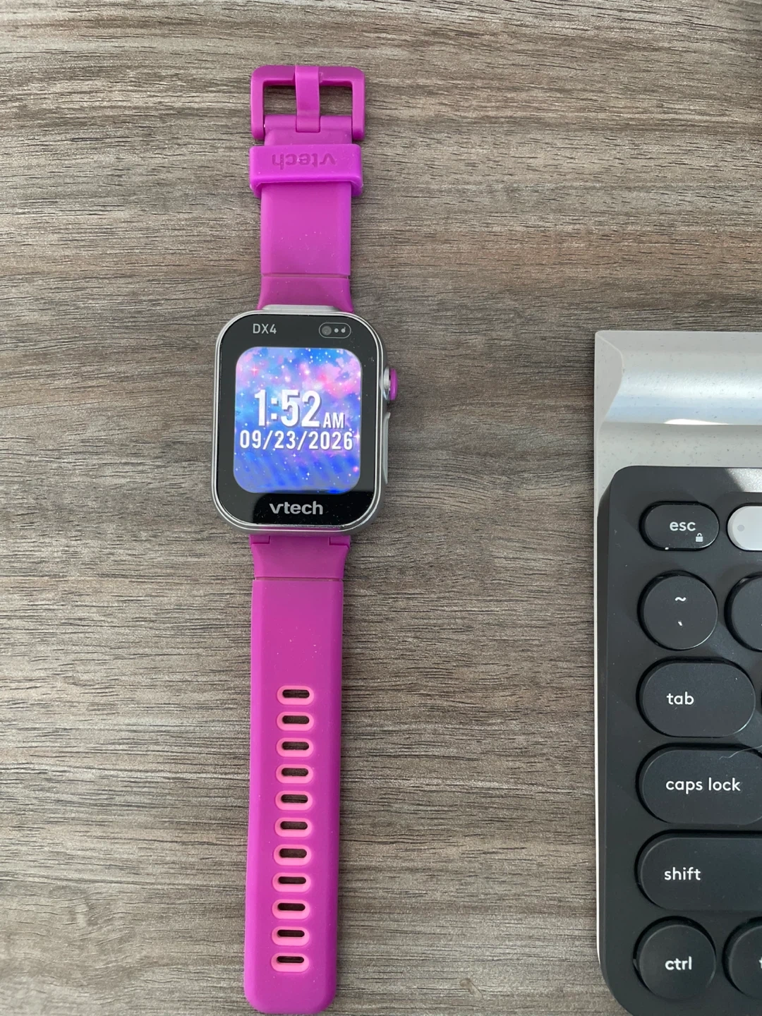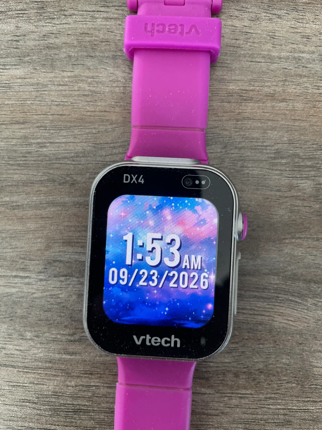 This VTech DX4 smartwatch is designed for kids. It features a bright pink band and a durable silver casing. The watch displays the time and date, and has a touch screen interface.