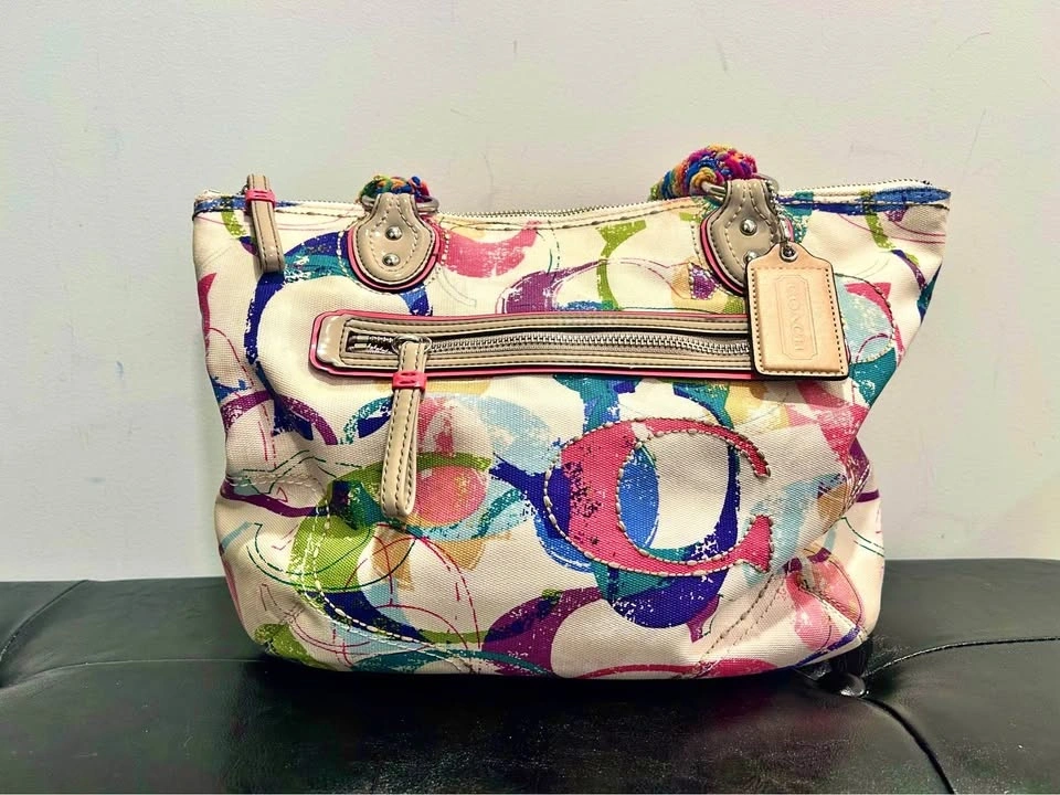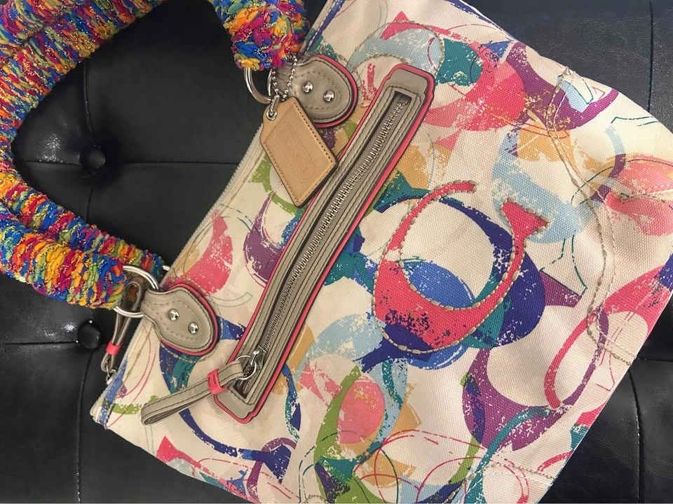 Customized Coach canvas tote with a cream base and multicolor print. Rainbow-wrapped crocheted handles add a whimsical touch. Bold & colorful. Design no 23372 (circa 2010). Both outside canvas and interior lining in great condition.