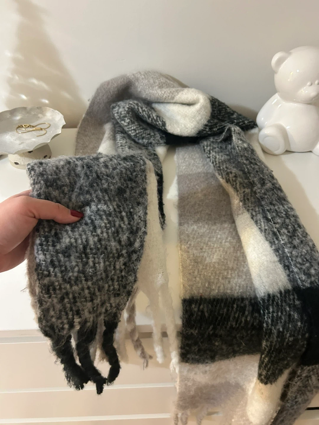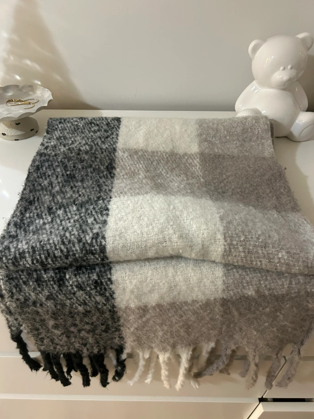 A cozy plaid scarf featuring shades of grey, white, and black. It's made from a soft, fuzzy material with tassels on the ends. This scarf is perfect for keeping warm on chilly days!