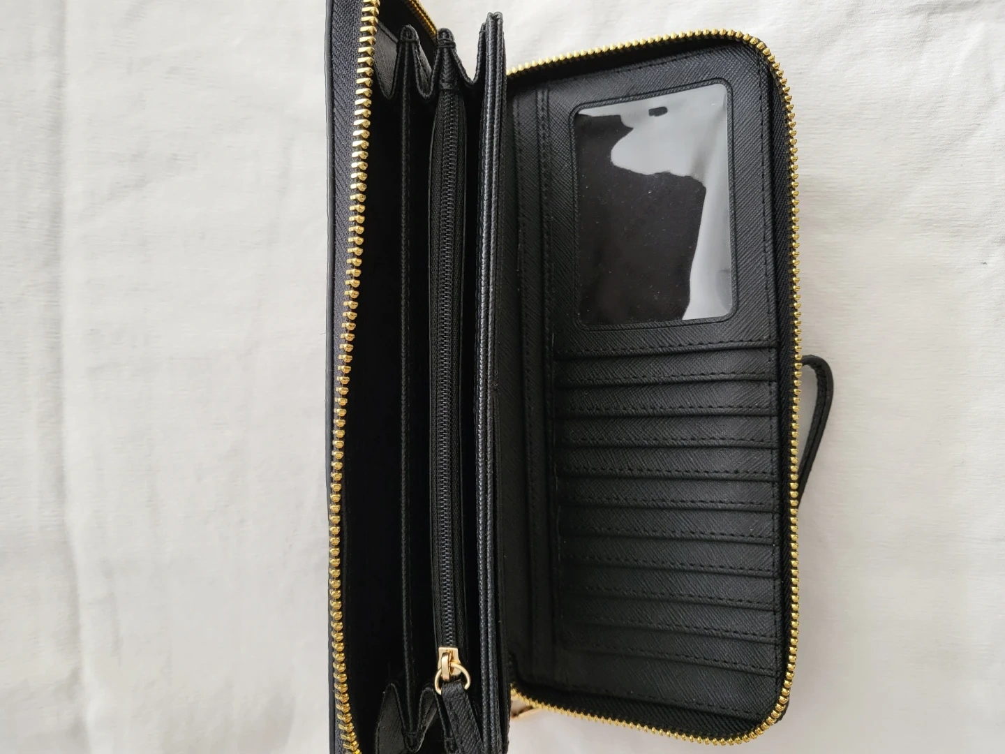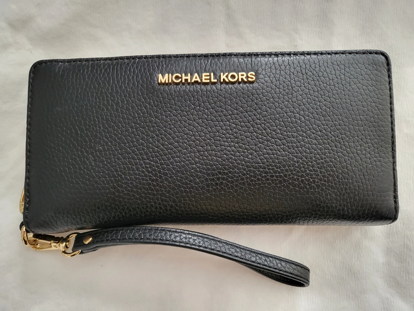 This is a Michael Kors wristlet wallet. It's black with gold-tone hardware. The wallet features multiple card slots and a zippered compartment. It's made of pebbled leather.
