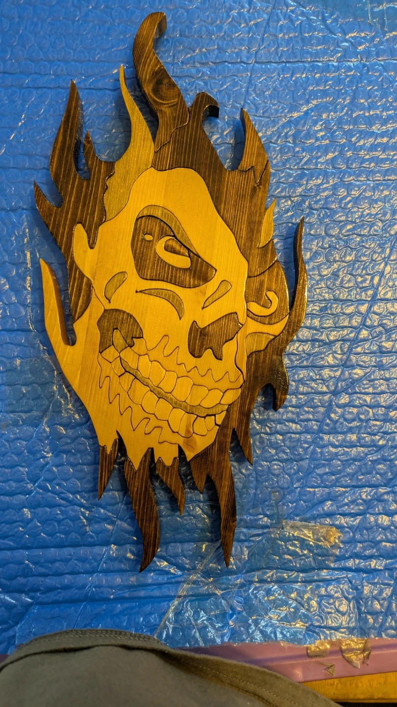Handcrafted wooden wall art depicting a skull with flames. It features a layered design with different wood tones. This piece would add a unique decorative touch to any room! Gloss finish. Hardboard backer. 7 7/8" W x 7/8" D x 16 3/8" H