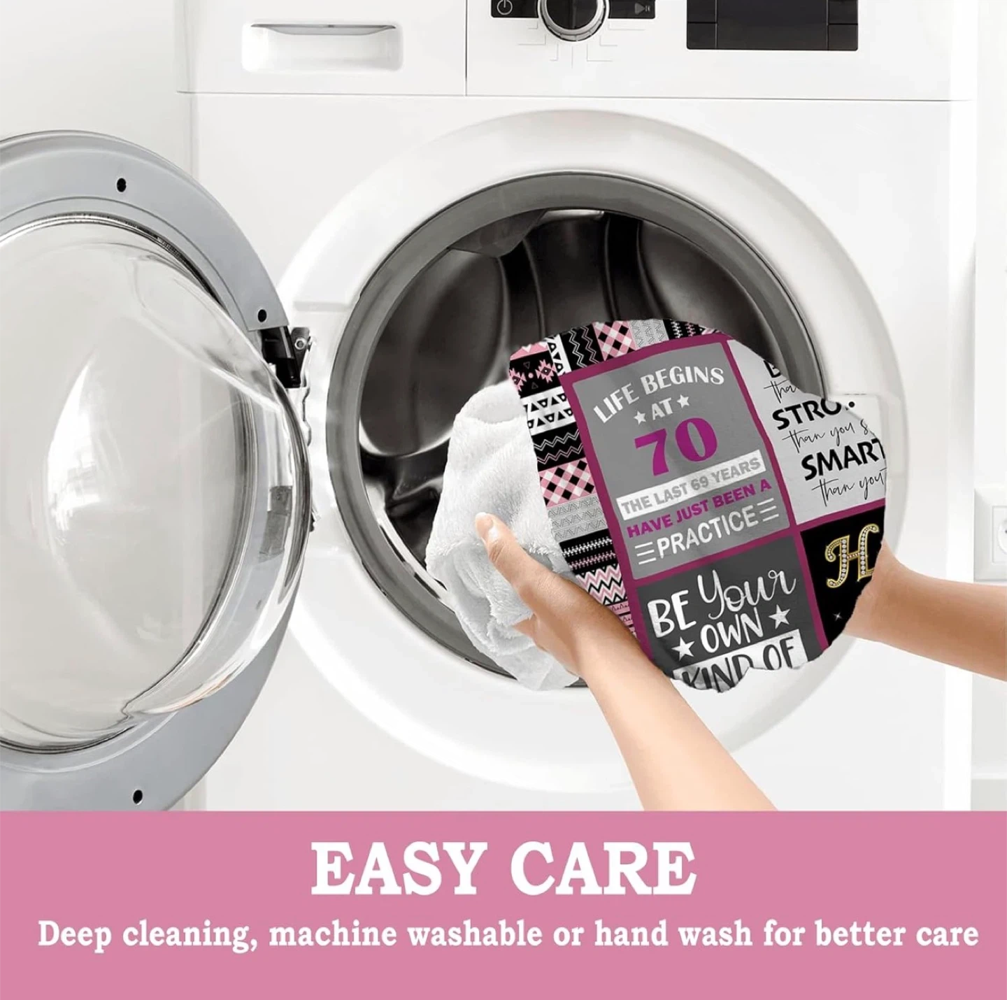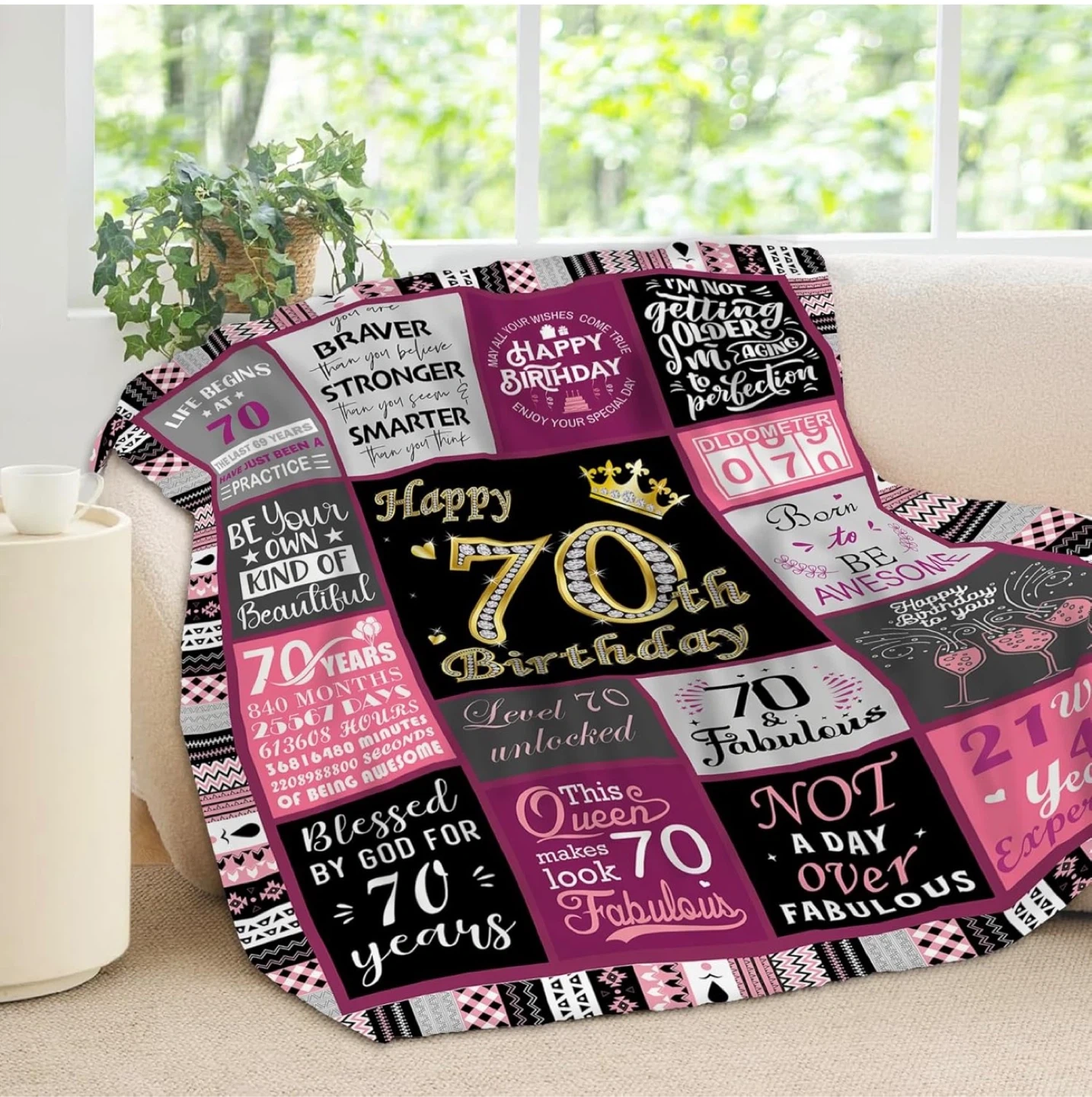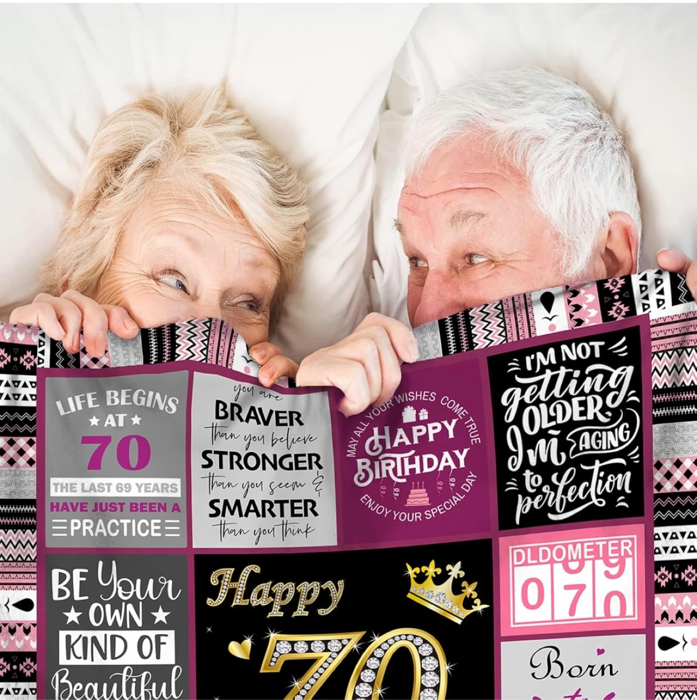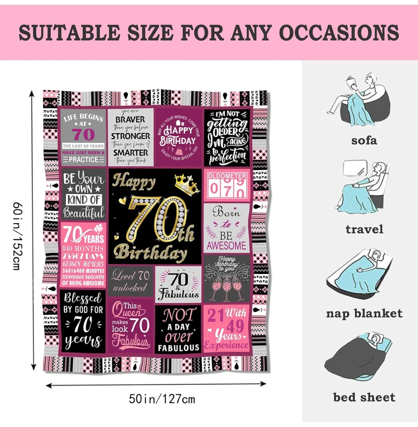 Celebrate a 70th birthday with this soft and cozy blanket. It features fun sayings and designs celebrating the special milestone. Made with a comfortable material for everyday use.