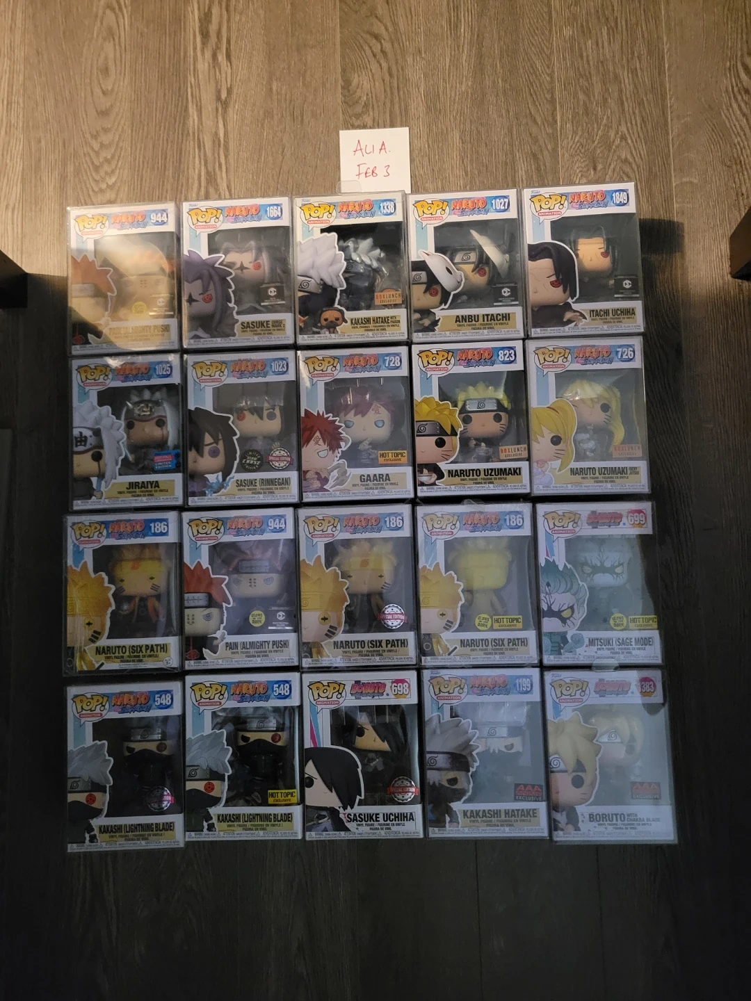 This is a collection of Funko Pop! vinyl figures from the Naruto series. It includes various characters like Naruto Uzumaki, Sasuke Uchiha, Kakashi Hatake, and more. These are collectible figures for fans of the anime.
