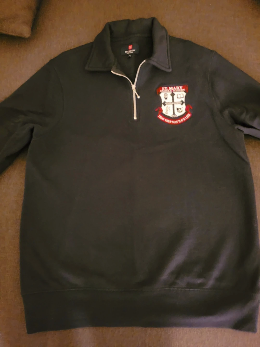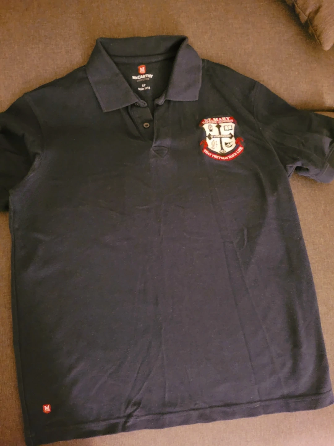 Bundle includes a dark navy McCarthy polo shirt with St. Mary's crest and a size medium sweatshirt with the same crest. Also includes grey dress pants. Perfect for school days!