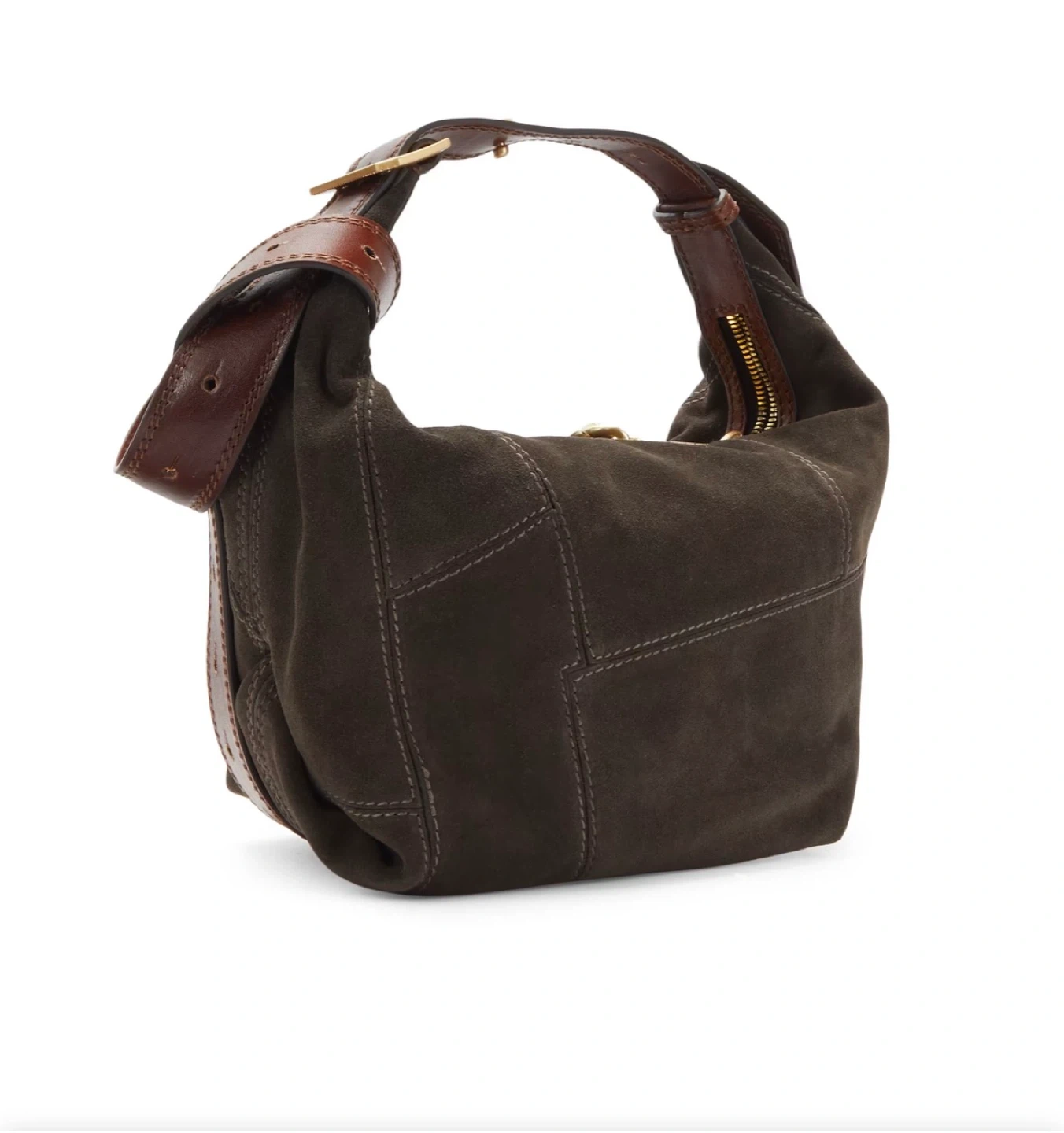 Chic brown suede shoulder bag with leather trim and gold-tone hardware. Features a patchwork design and a zippered top closure. Includes a stylish chain detail.