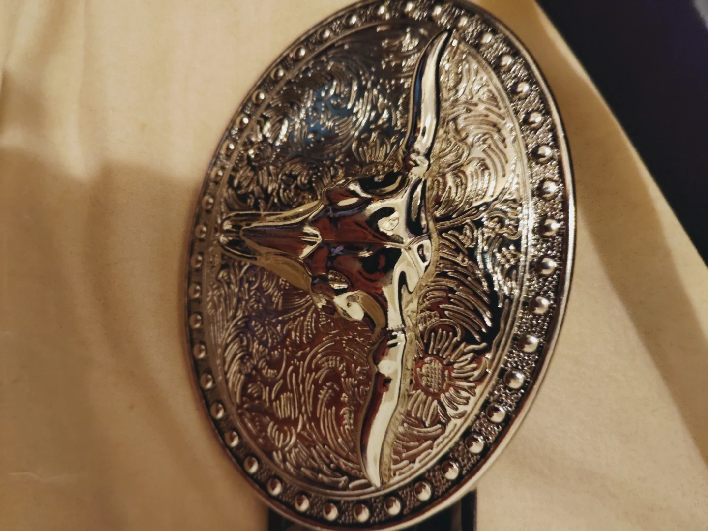 This western-style belt features a decorative silver-tone buckle with a bull head design. It's made from black leather. The buckle has intricate scrollwork and a beaded edge detail.