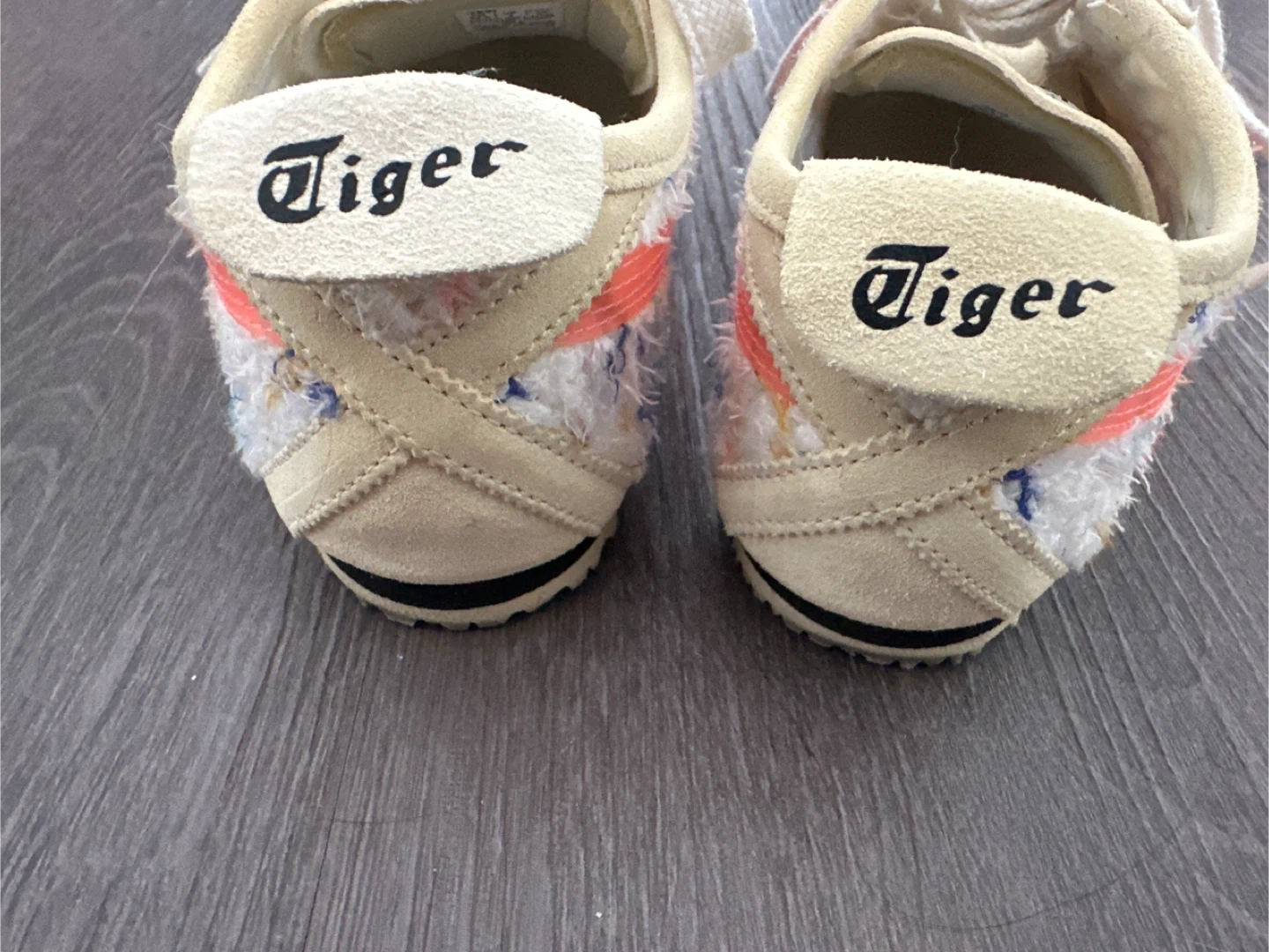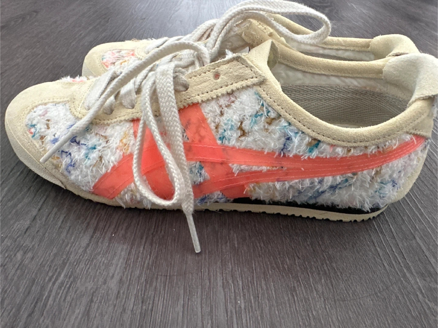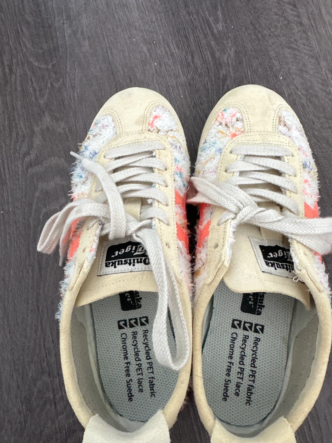 Onitsuka Tiger low-top sneakers with a colourful fabric upper and cream suede accents. They're made with recycled PET fabric laces and chrome-free suede. These shoes are a size US 4,EURO 36 in CM 22.5. Size 5