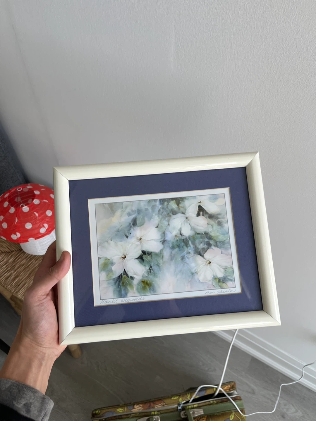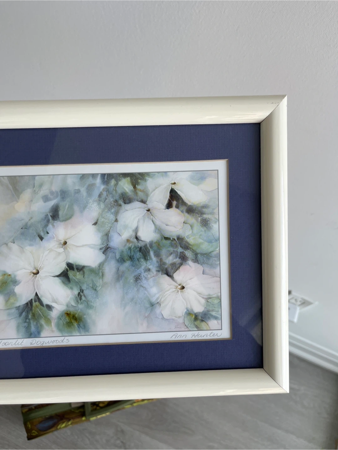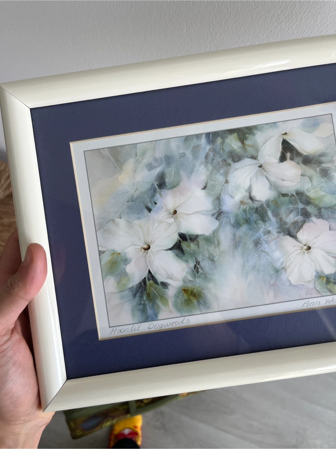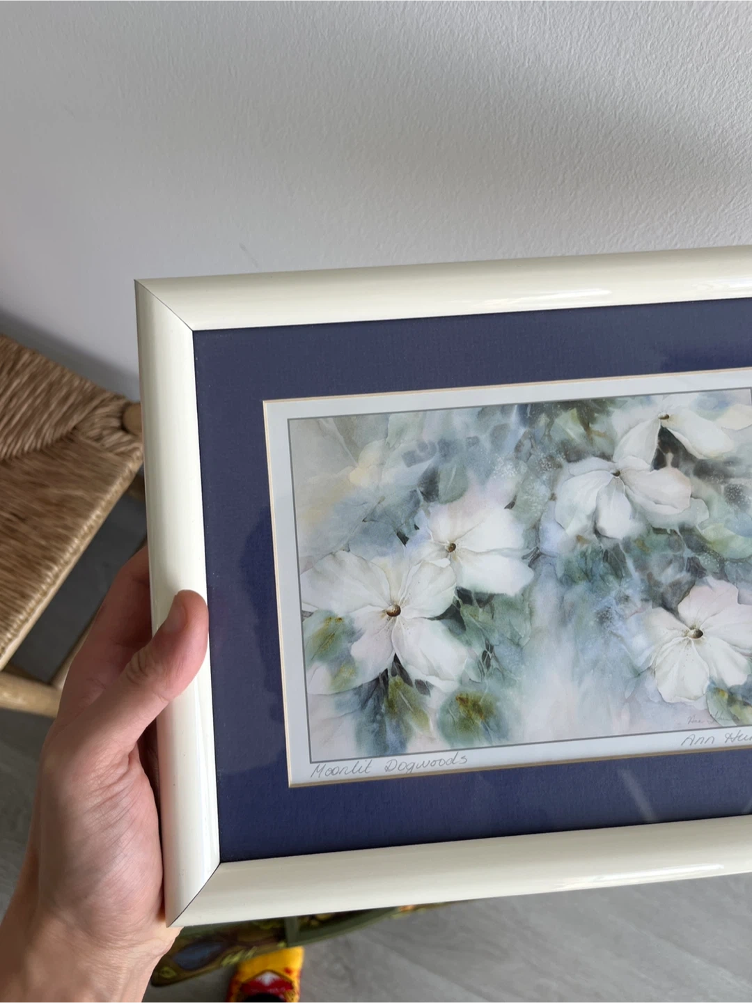 This framed "Moonlit Dogwoods" print features a beautiful floral watercolour by artist Ann Keffer. It's matted in navy blue and framed in a simple cream-coloured border. A lovely piece to brighten up any room!