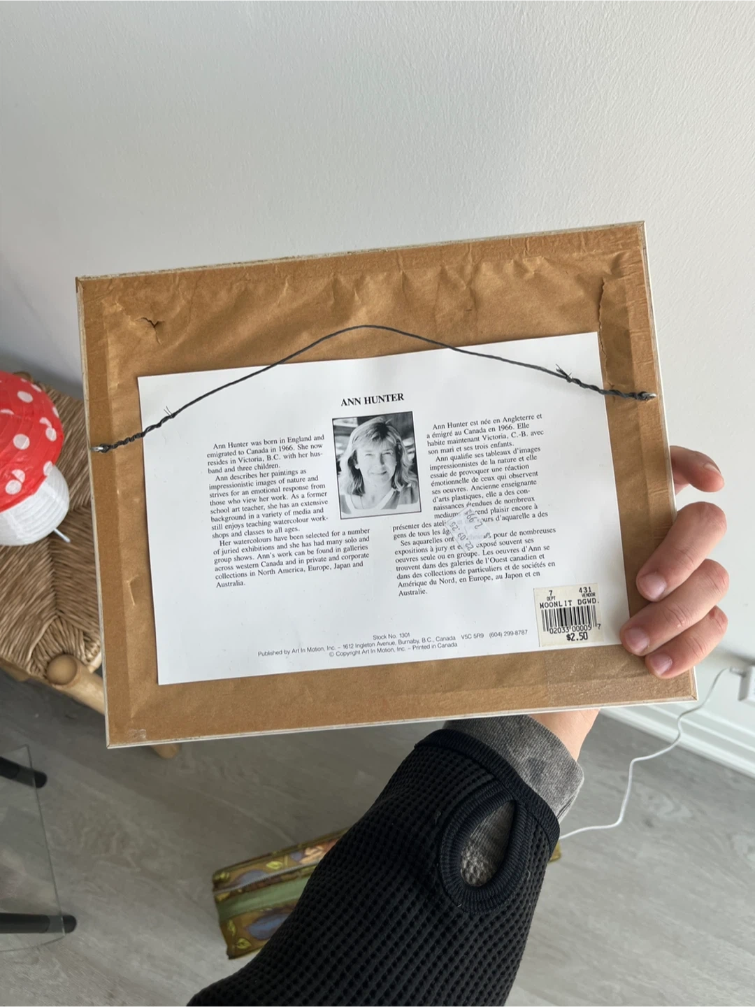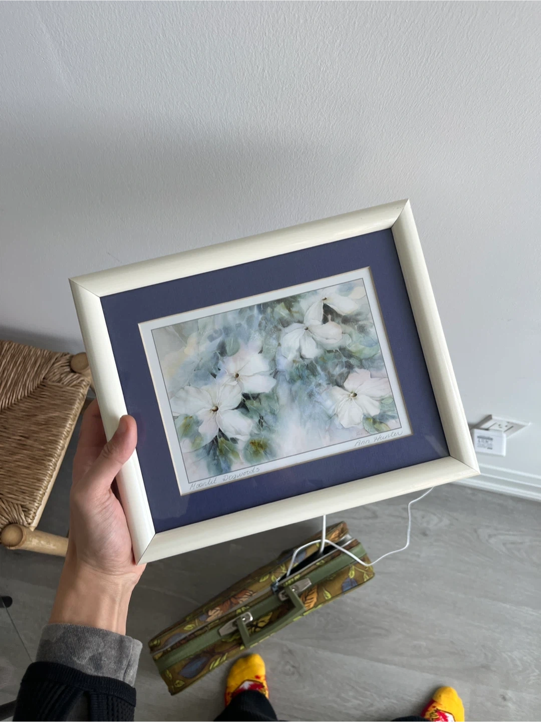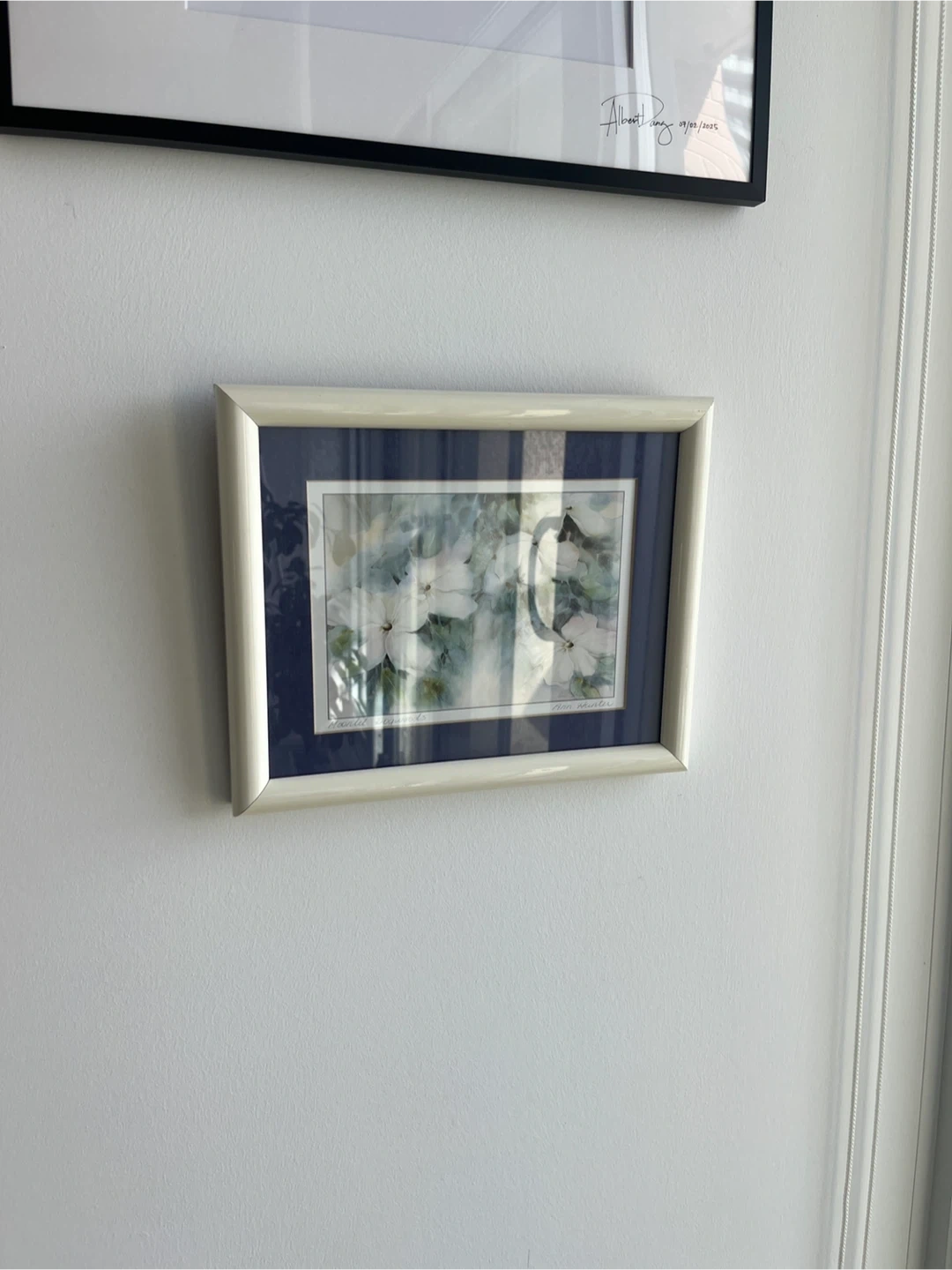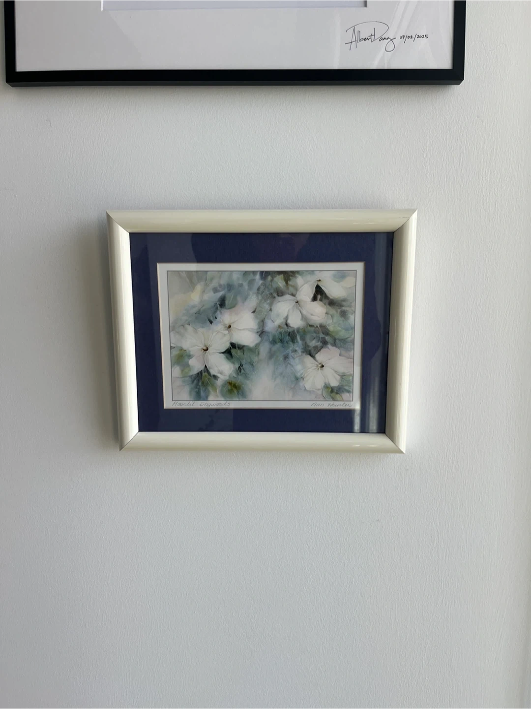 This framed "Moonlit Dogwoods" print features a beautiful floral watercolour by artist Ann Keffer. It's matted in navy blue and framed in a simple cream-coloured border. A lovely piece to brighten up any room!