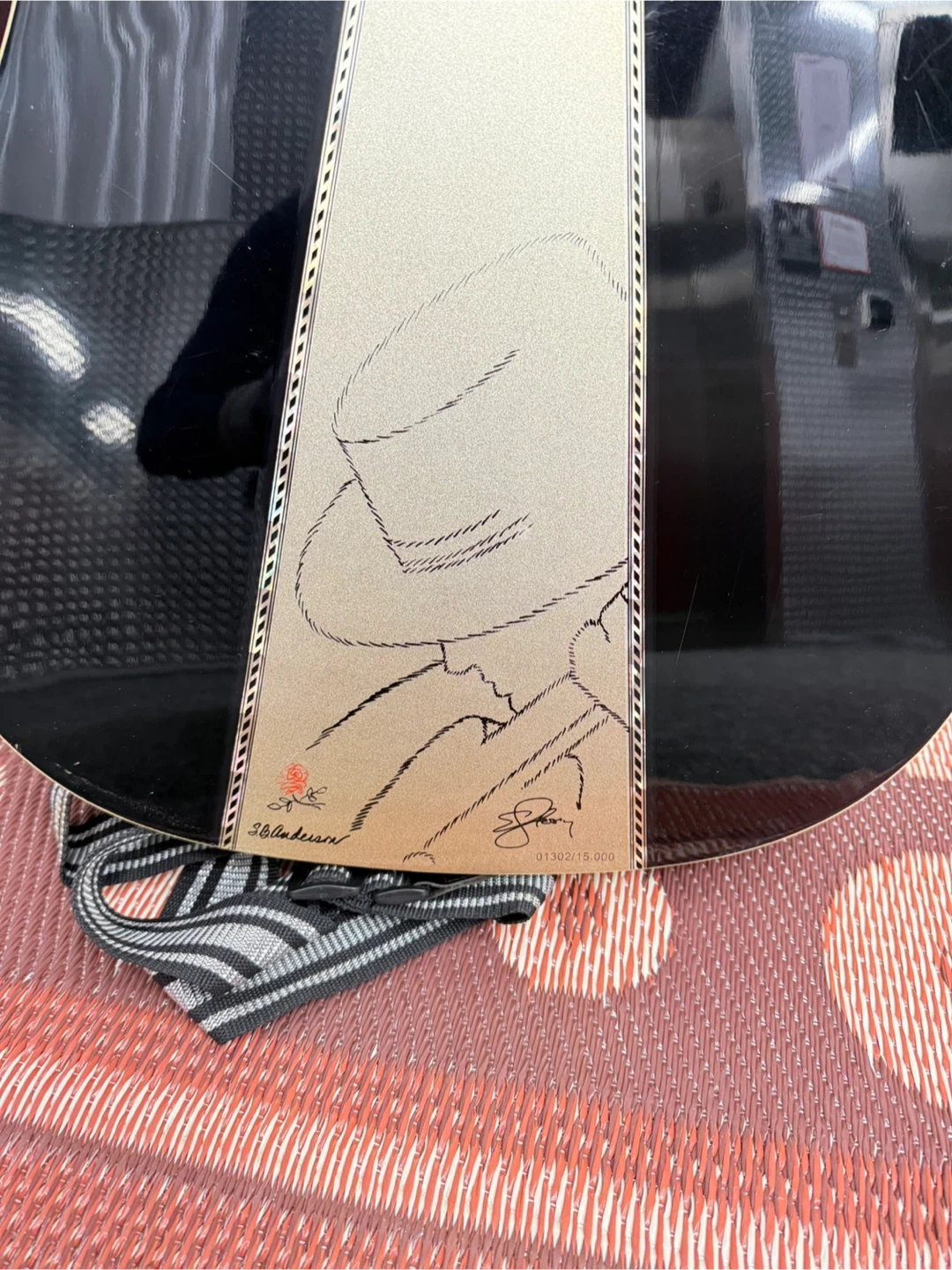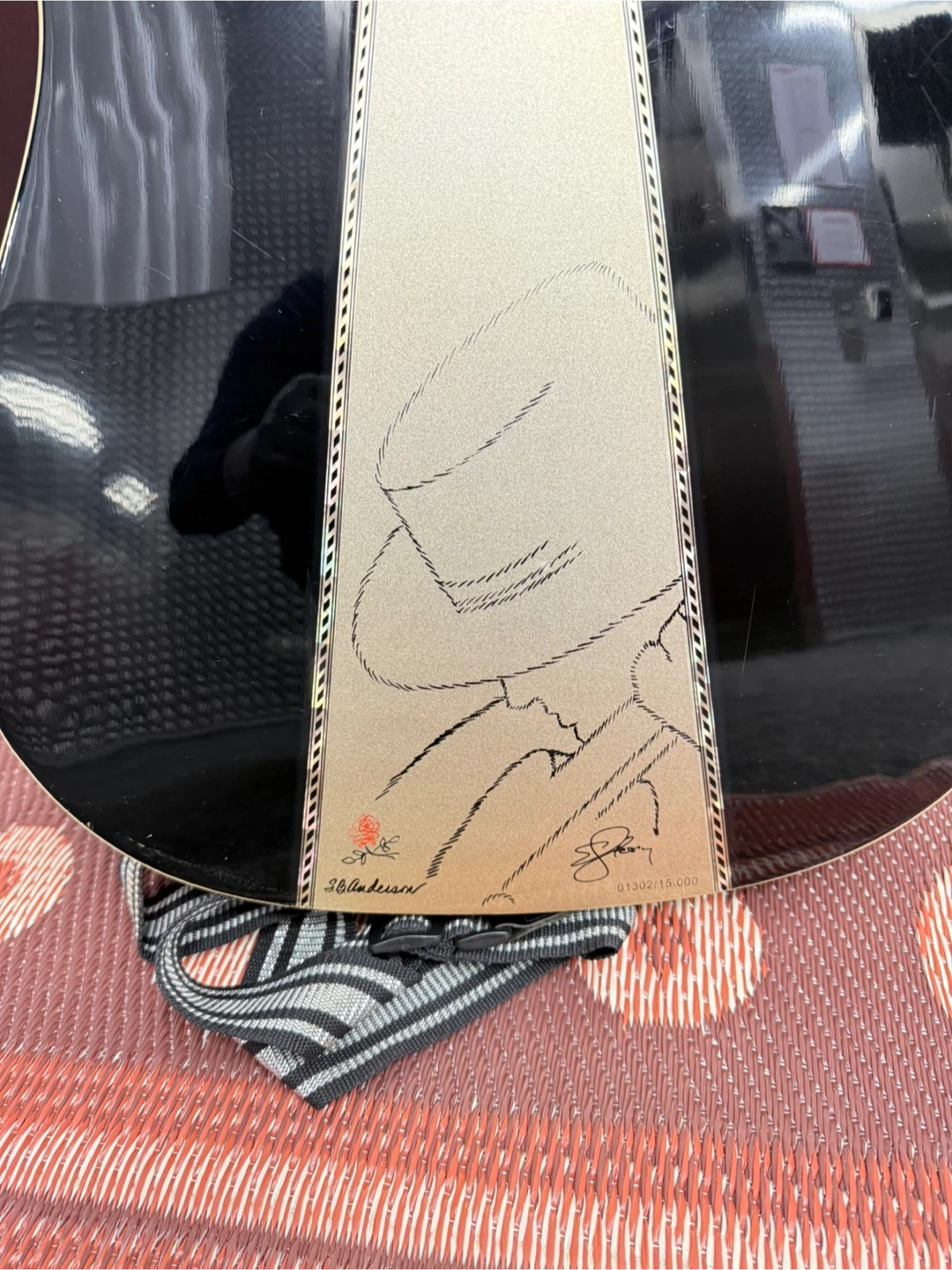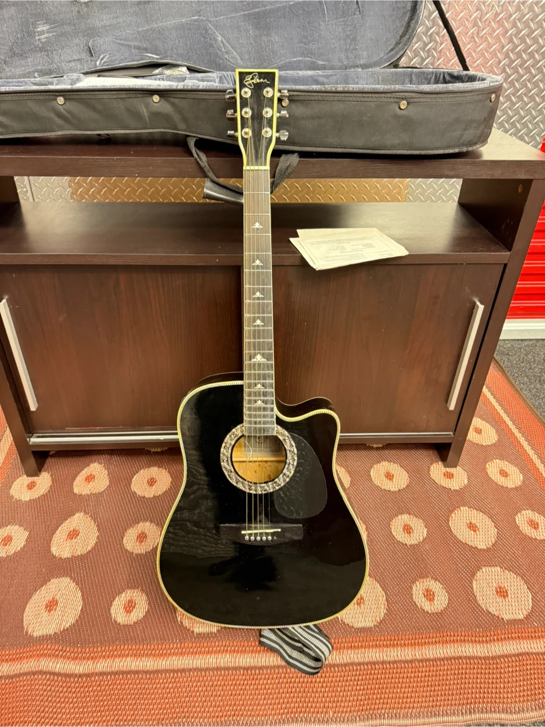 Black Takamine acoustic-electric guitar. Includes a hard case for protection and transport. The guitar features a cutaway body and decorative inlay on the back.