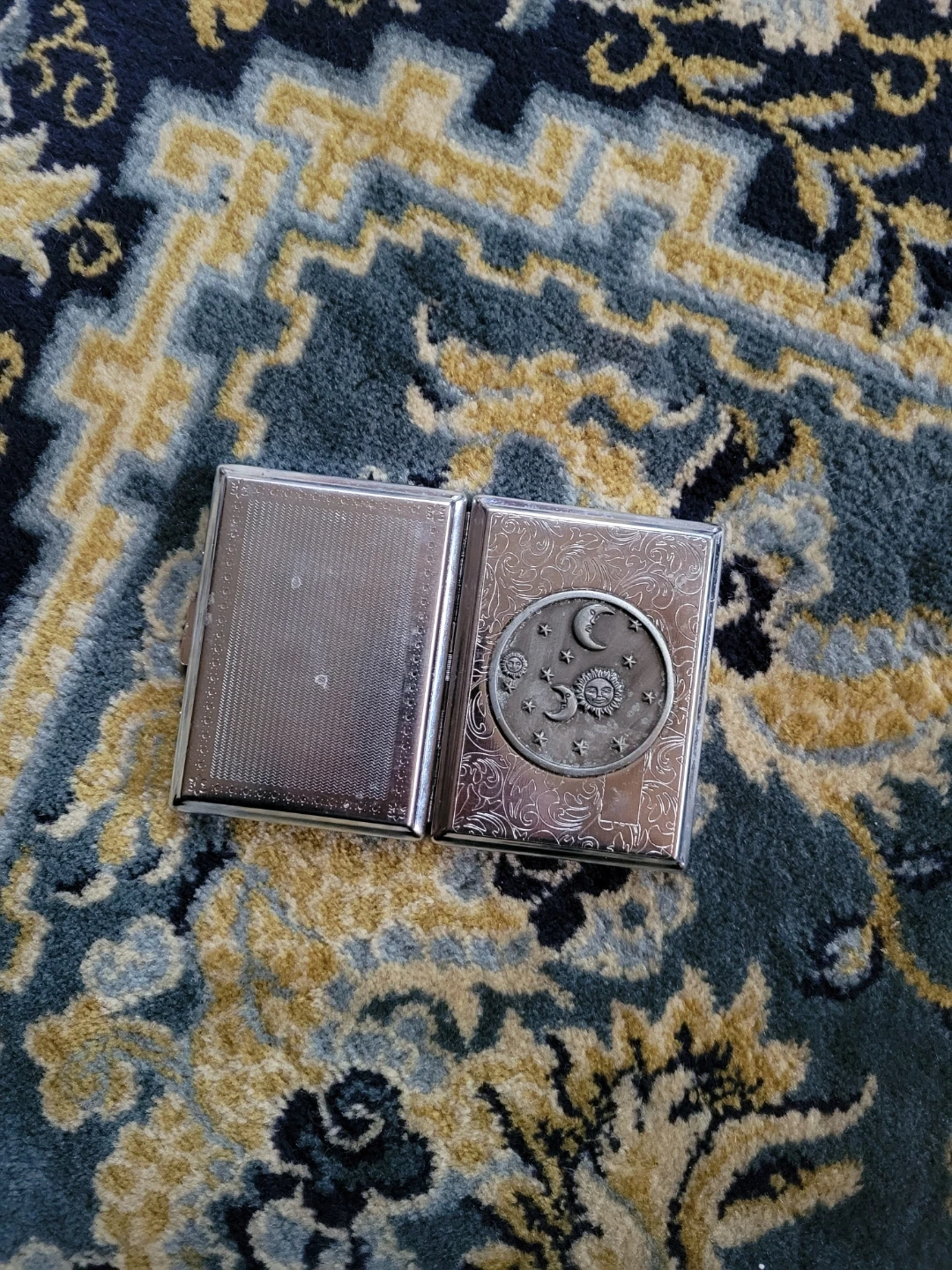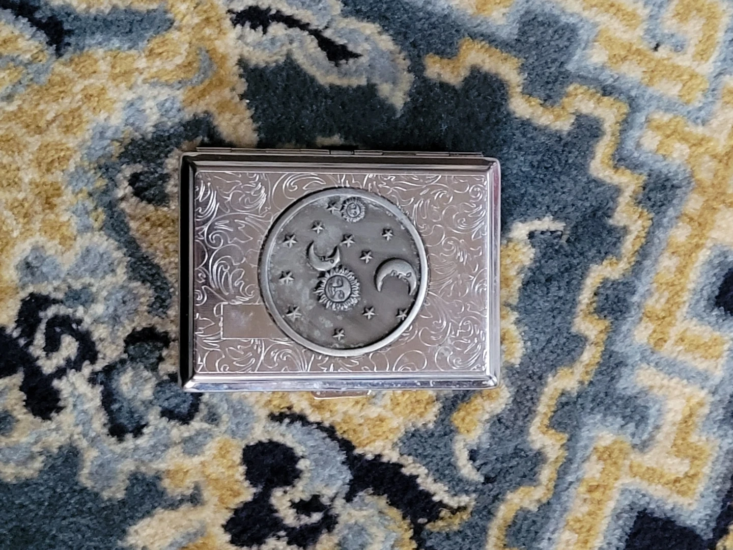Art Deco style cigarette case, adorned with a celestial design featuring moons, stars, and suns!