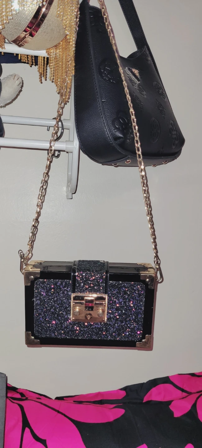 Sparkly black clutch purse designed like a mini trunk. It features a glitter panel on the front and a secure clasp closure. Includes a detachable gold-tone chain strap.