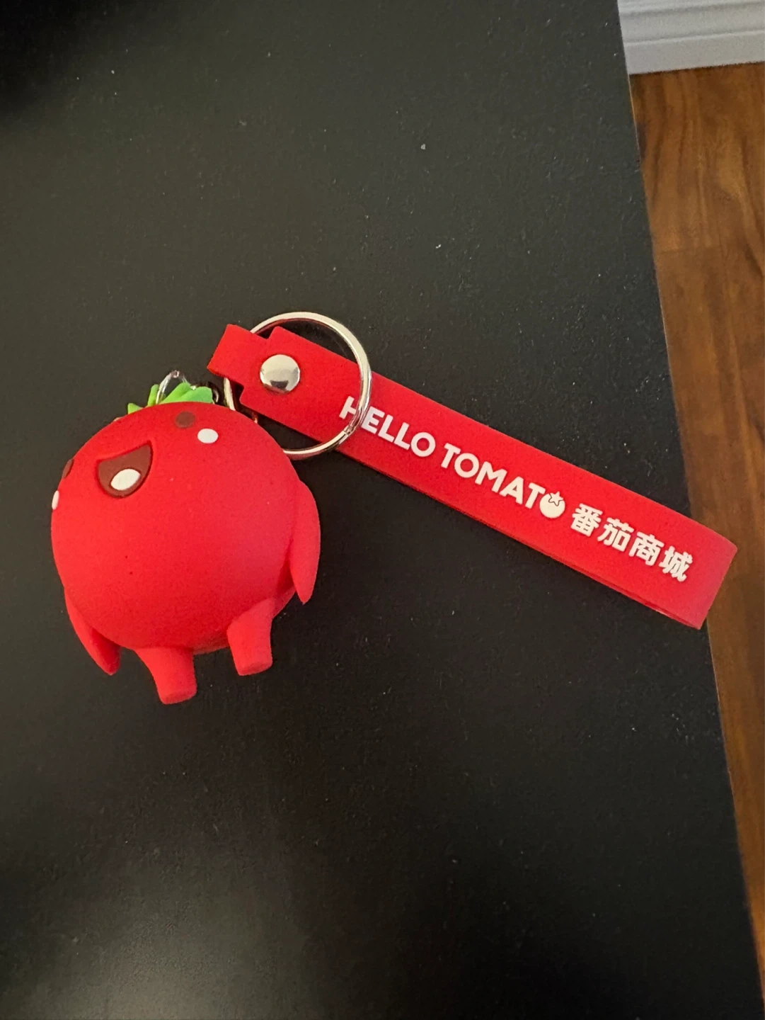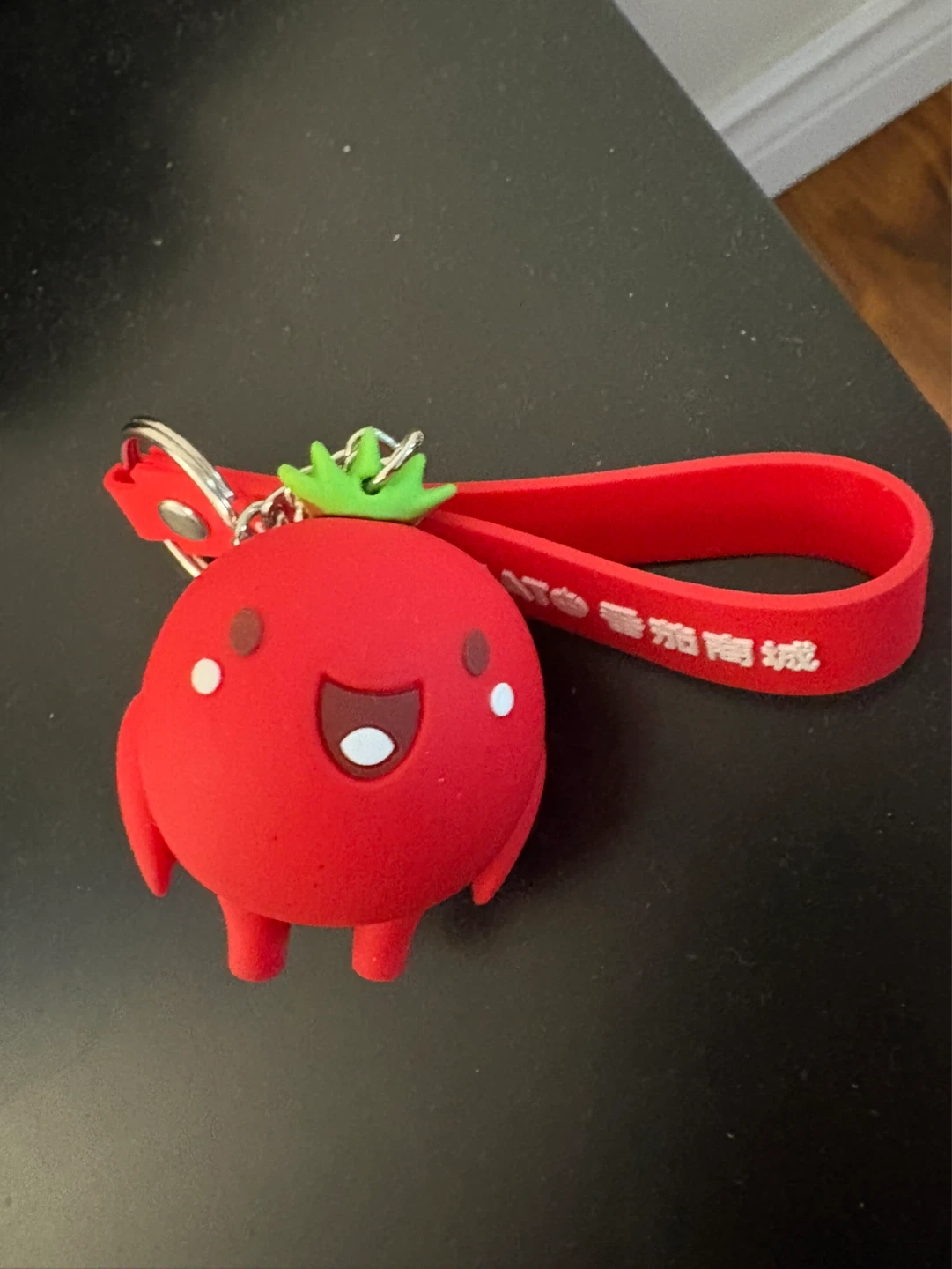 Cute red tomato keychain with a fun character design. It's made of silicone and has a red strap. Great for adding some personality to your keys or bag!