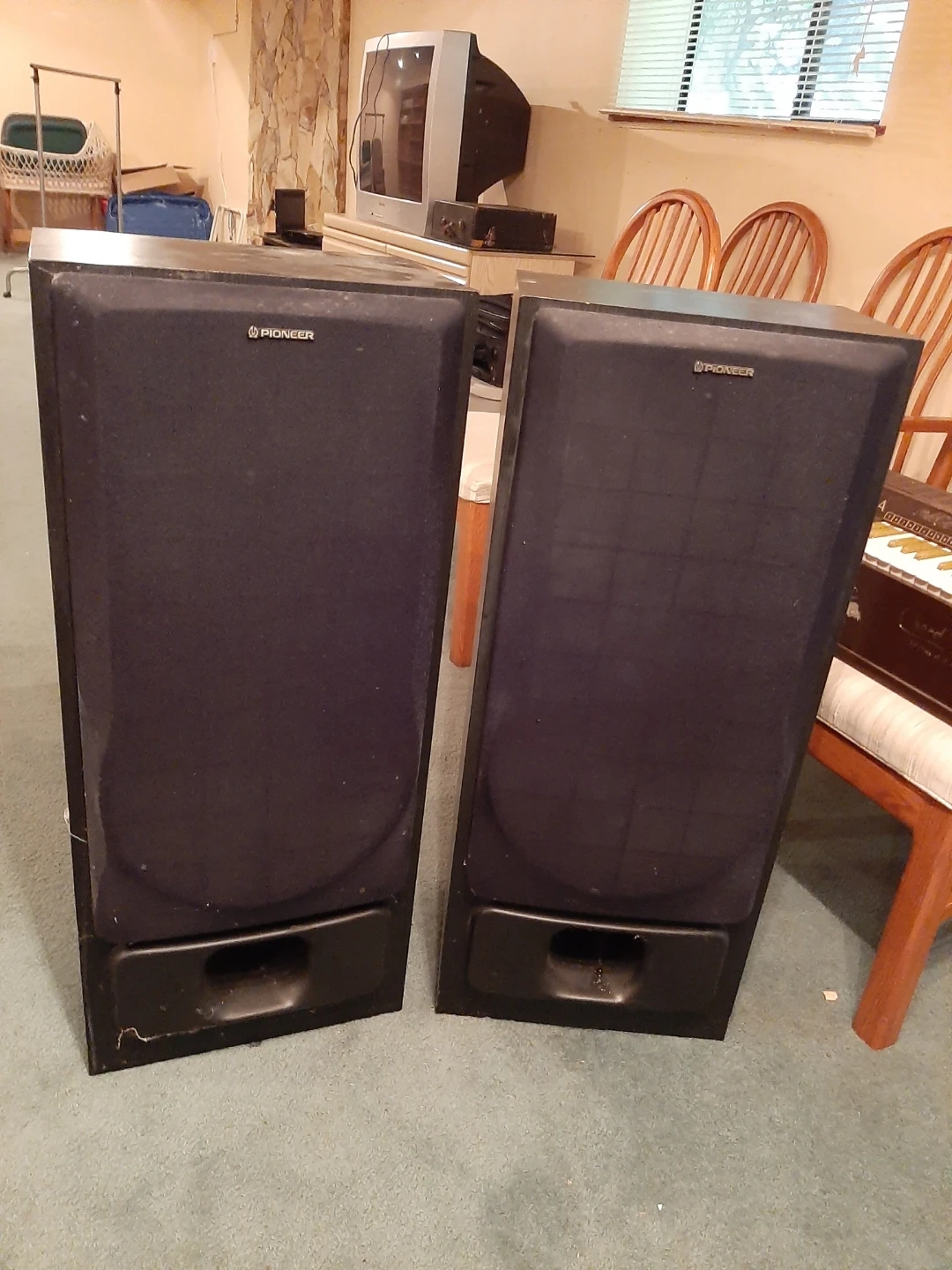 A pair of black Pioneer speakers. They're great for setting up a home audio system. These would be useful for anyone looking to improve their sound experience.