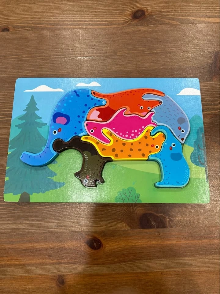 Colorful wooden animal puzzle with chunky pieces designed for toddlers and preschoolers. Great for developing fine motor skills, problem-solving, and animal recognition.