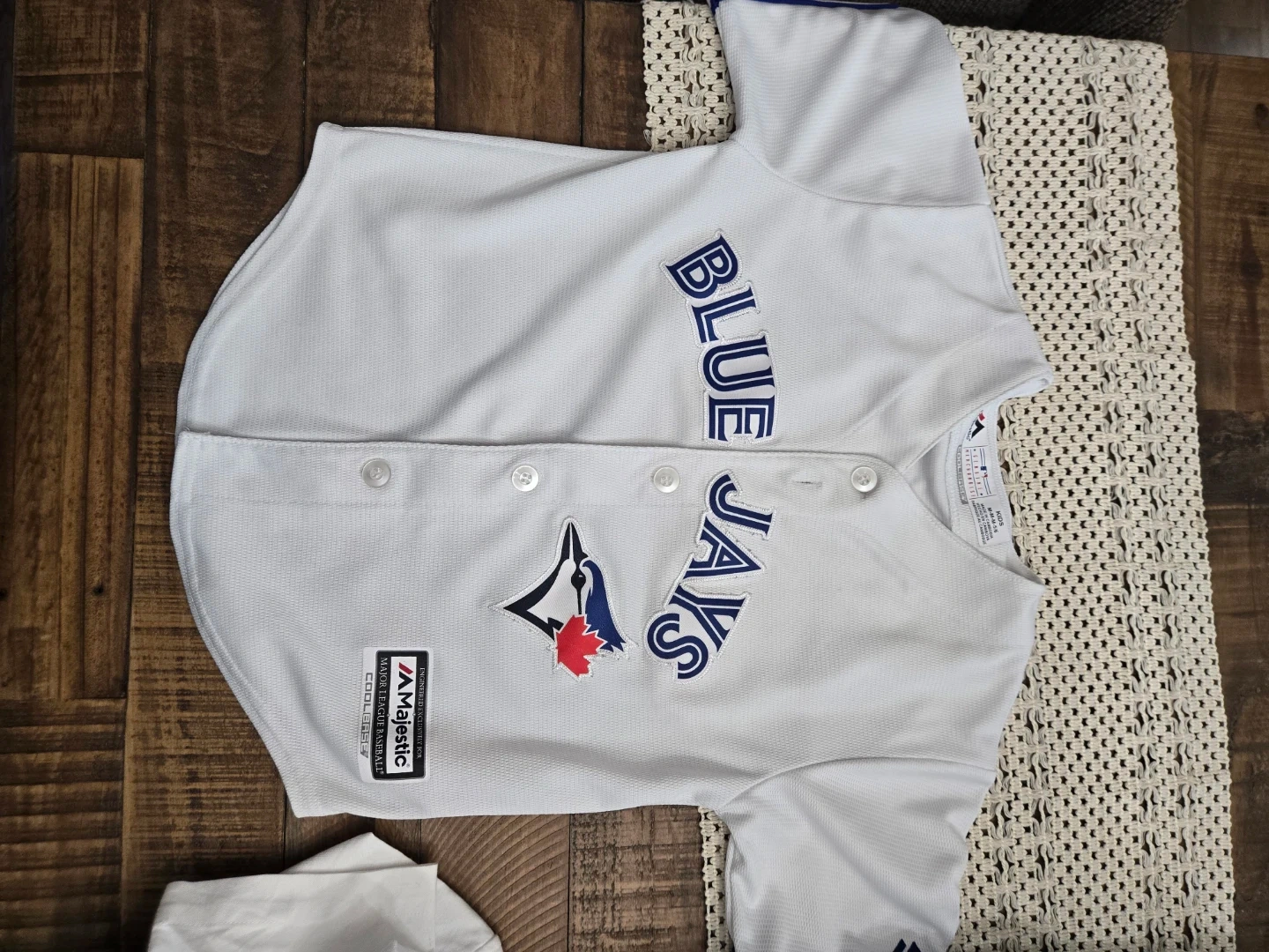 White Majestic Toronto Blue Jays kids' baseball jersey. Features the Blue Jays logo and lettering. Size M (kids M-M-5/6).