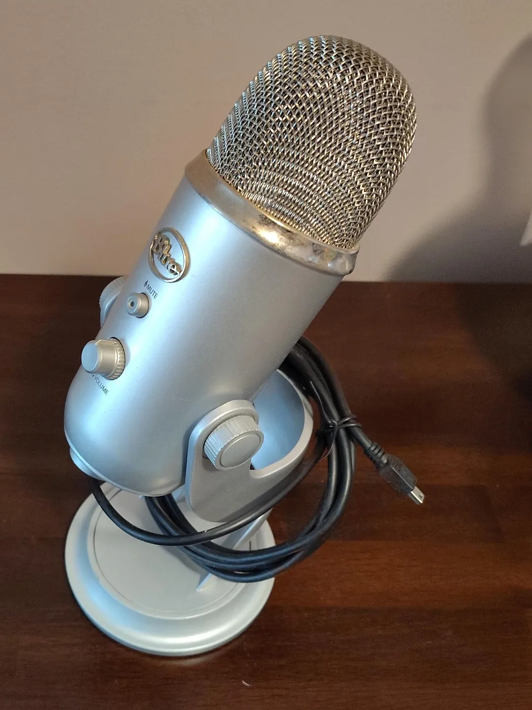 This is a Blue Yeti USB microphone in silver. It's a versatile microphone suitable for streaming, podcasting, or voiceovers. It features a desktop stand and a mute button.