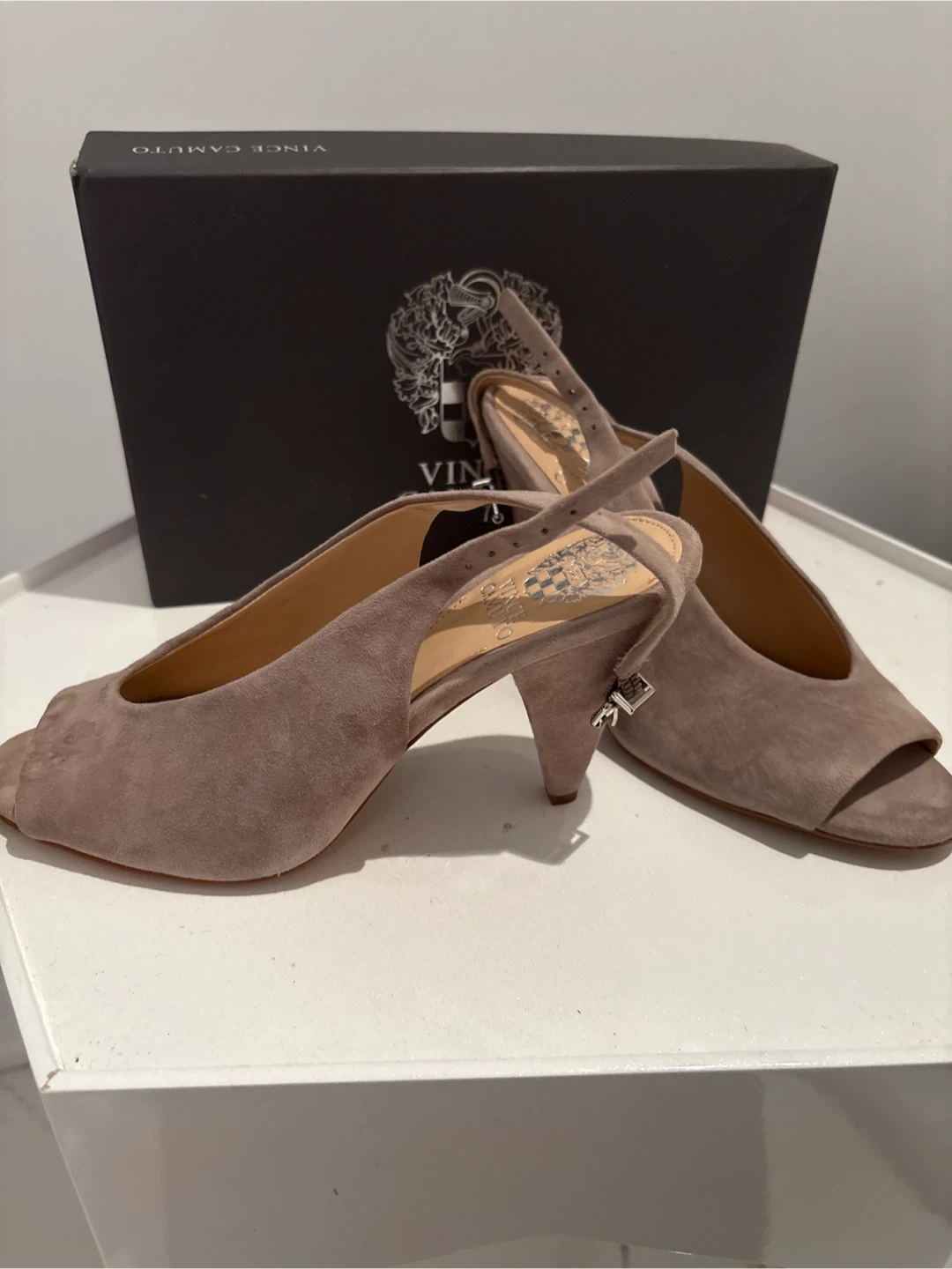 Vince Camuto slingback heels in a taupe suede. These peep-toe pumps have an adjustable ankle strap and a comfortable block heel. They're made of suede material and come with the original box. Size 7.5M.