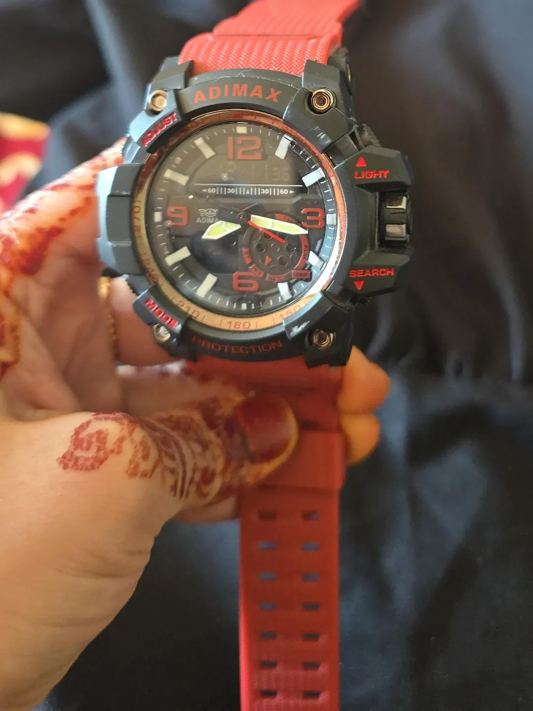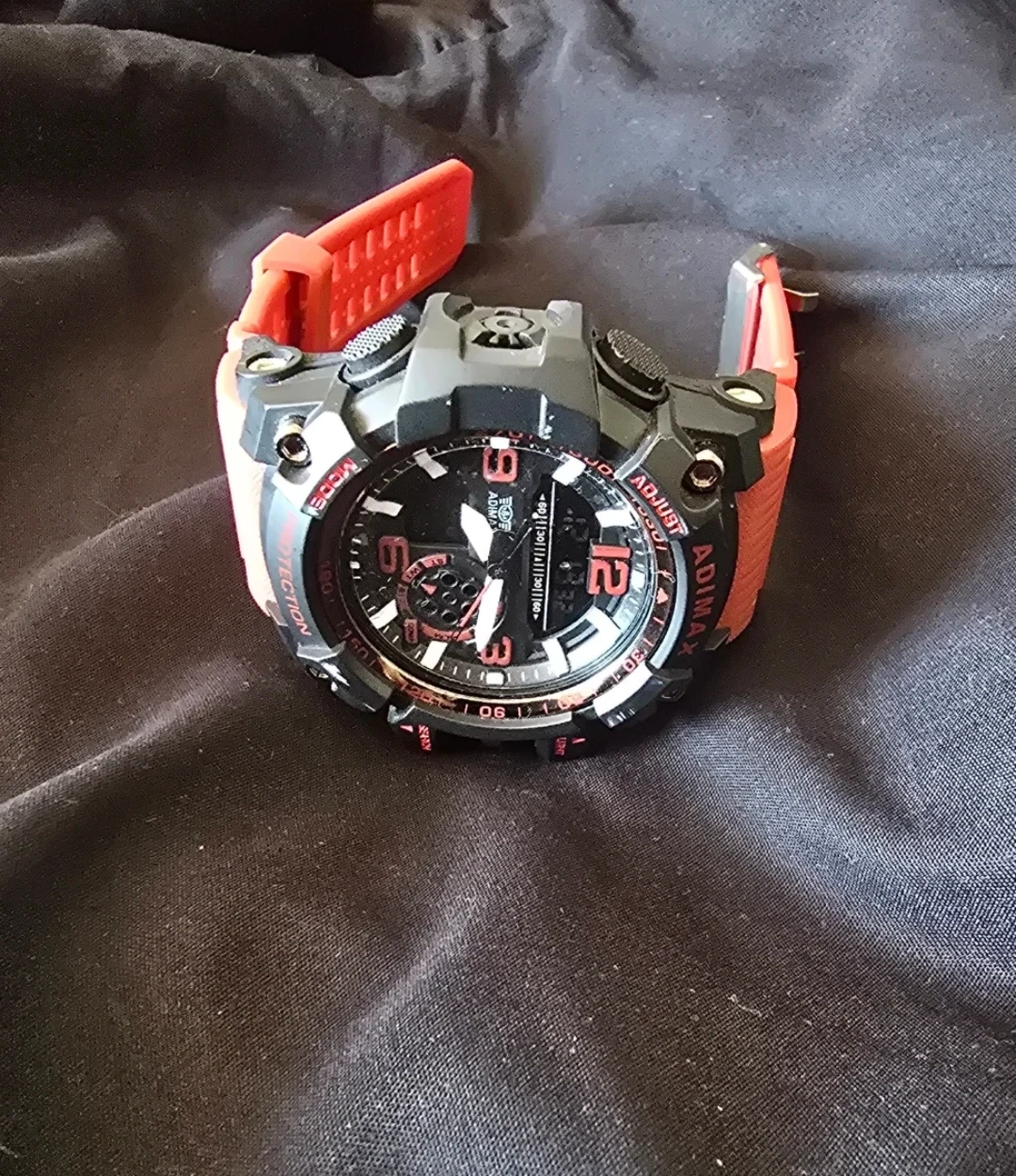This Adimax watch features a bold black and red design. It offers both digital and analog time displays. The strap is made of durable red rubber.