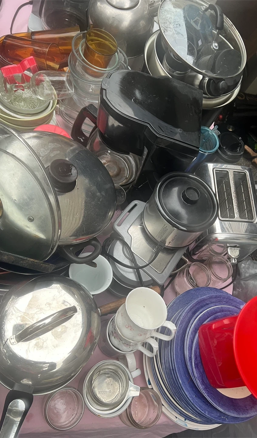 This lot includes various kitchen items such as pots, pans, plates, mugs, and a toaster. Also visible are glass jars and other assorted kitchen accessories. Great for stocking up a new kitchen or replacing old items! Price range from $1 to $15