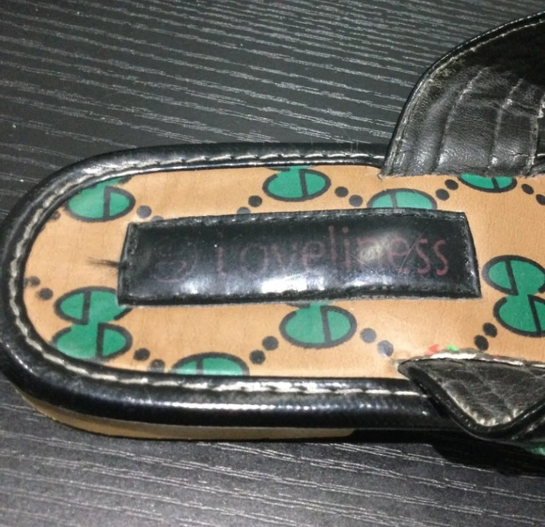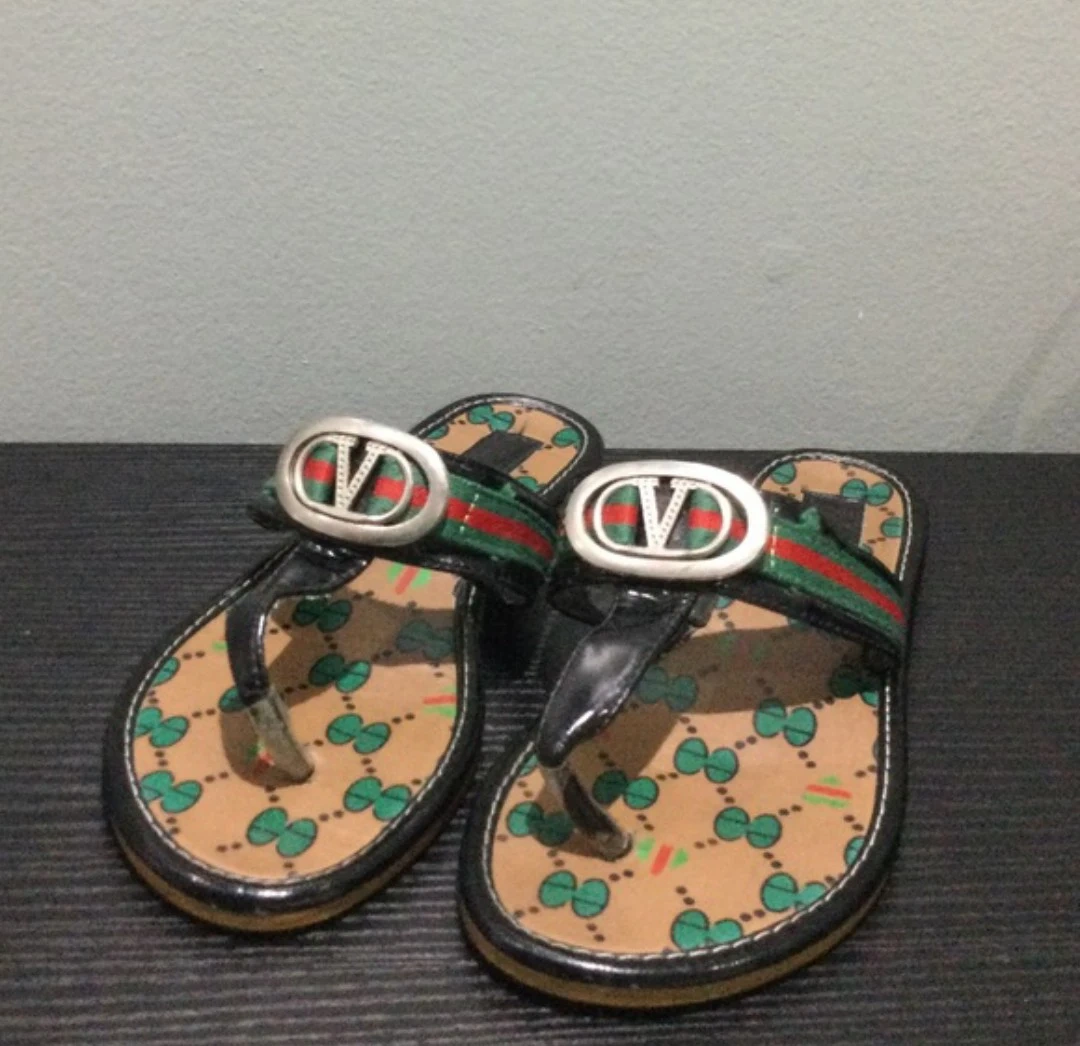 Loveliess thong sandals with green and red stripe detail. Features a patterned footbed and black trim. Used good condition. From a smoke and pet free home.