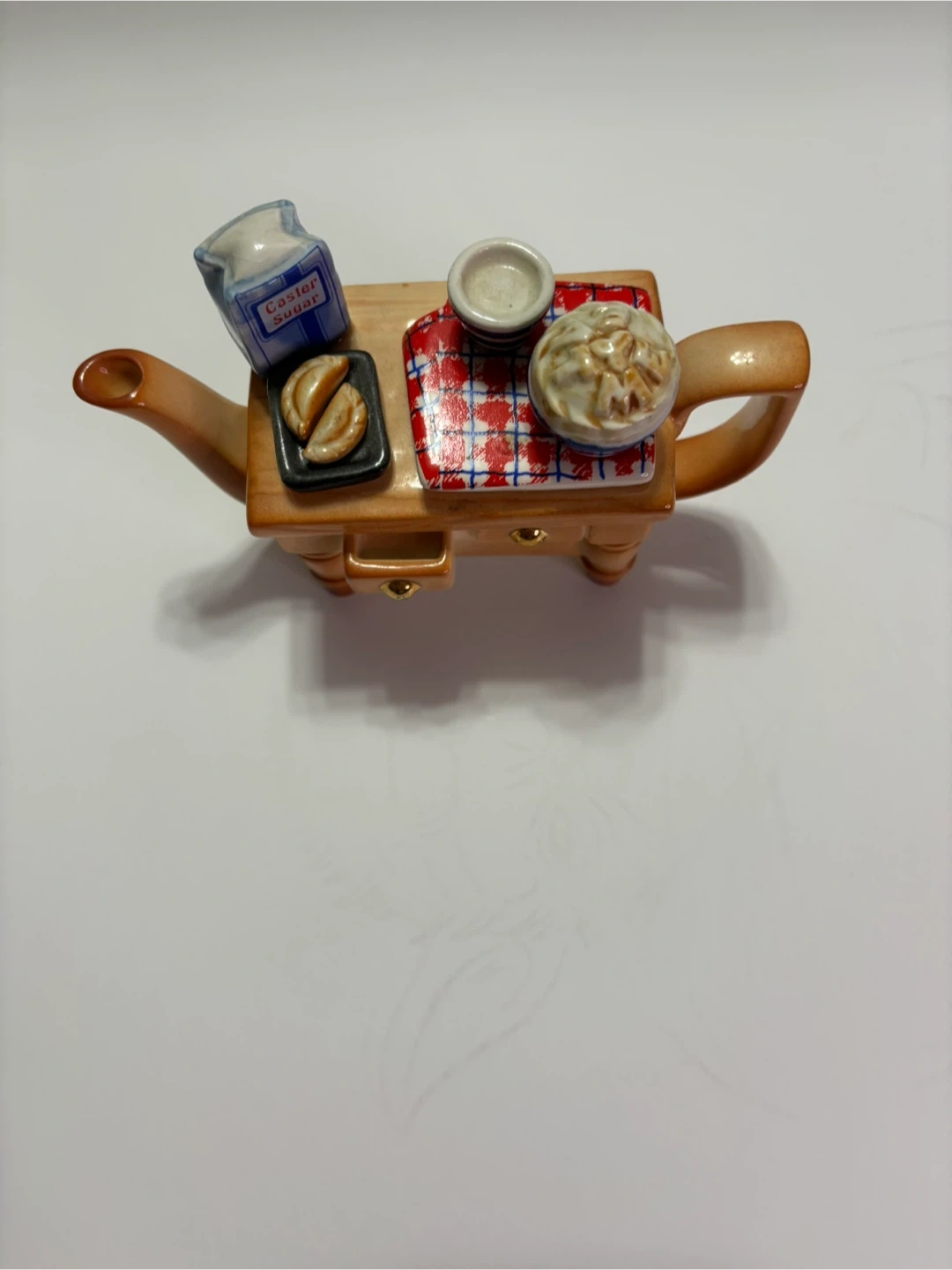 This is a charming vintage ceramic teapot designed as a miniature table set. It includes a caster sugar container, a small bowl, and a dish with pastries, all arranged on a table-shaped teapot. It's a unique and whimsical piece for collectors or anyone who appreciates vintage decor.
