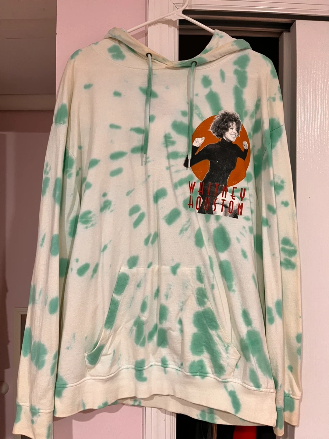 White and green tie-dye hoodie featuring a graphic of Whitney Houston on the front. There is a little stain around the hood because it’s been in my closet for a while but with a little wash it would be all good. Large but is a little big.