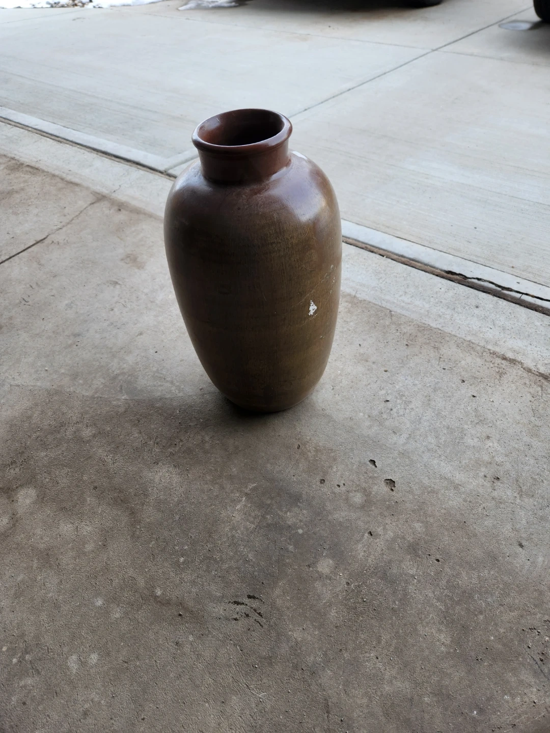 Tall, rustic ceramic vase in a deep brown hue. It has a wide opening and a bulbous body. Perfect for displaying large floral arrangements.