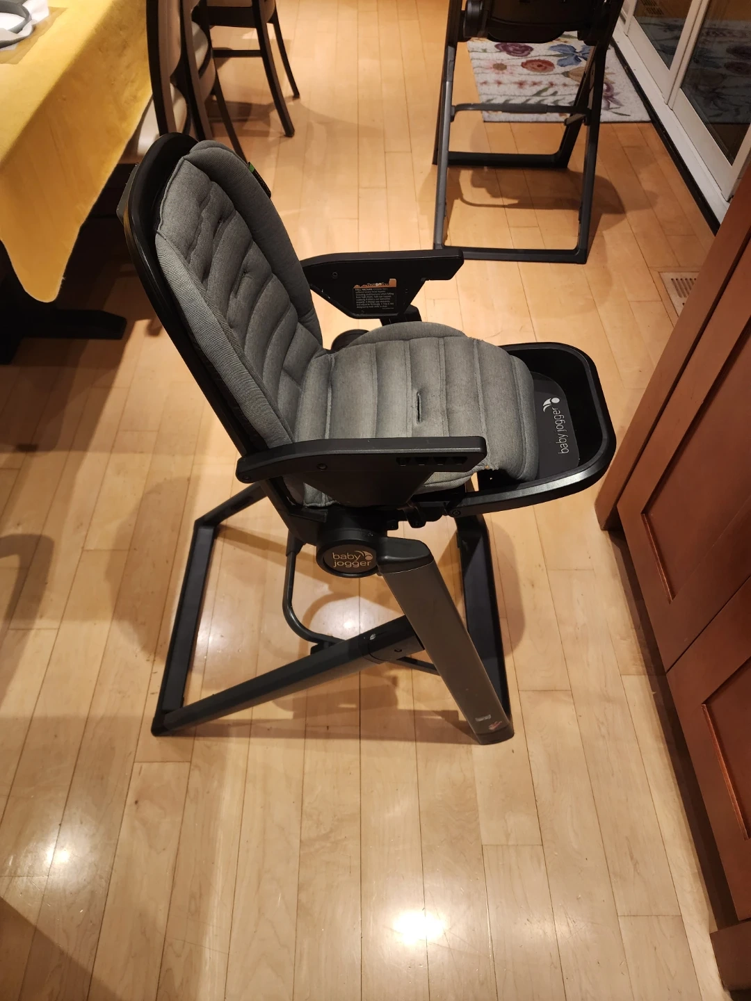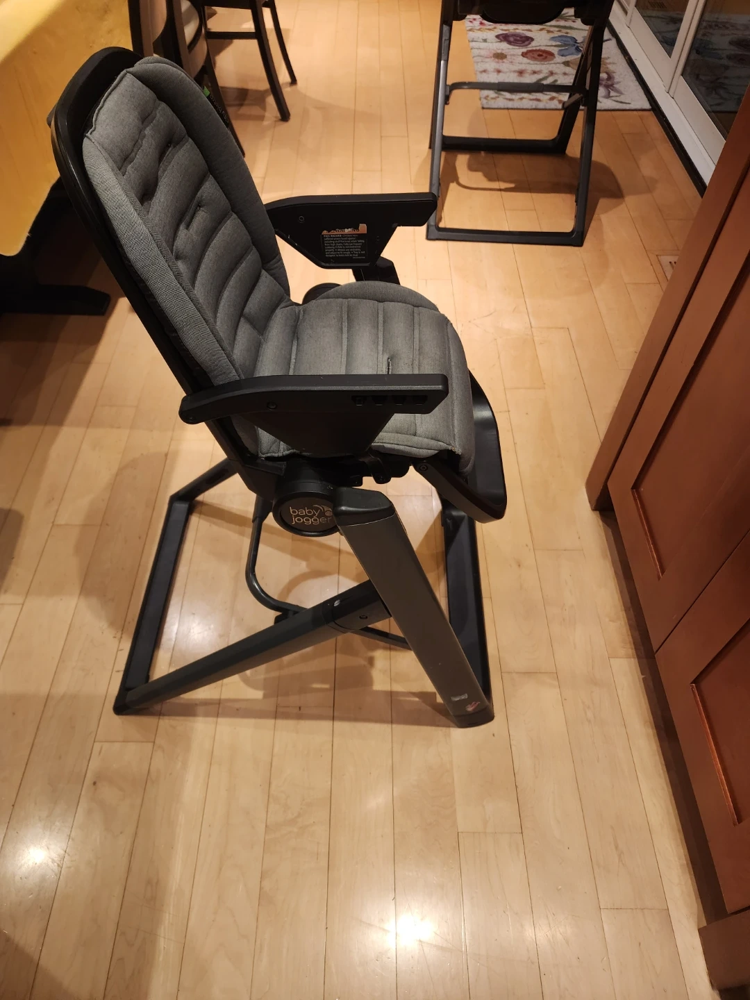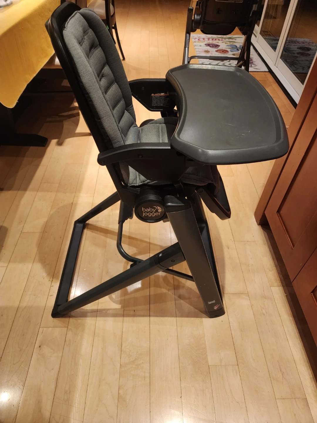 This Baby Jogger City Bistro high chair comes in a grey fabric. It has a removable tray and a fold-up design for easy storage. Its sleek design makes it a great addition to any kitchen.
