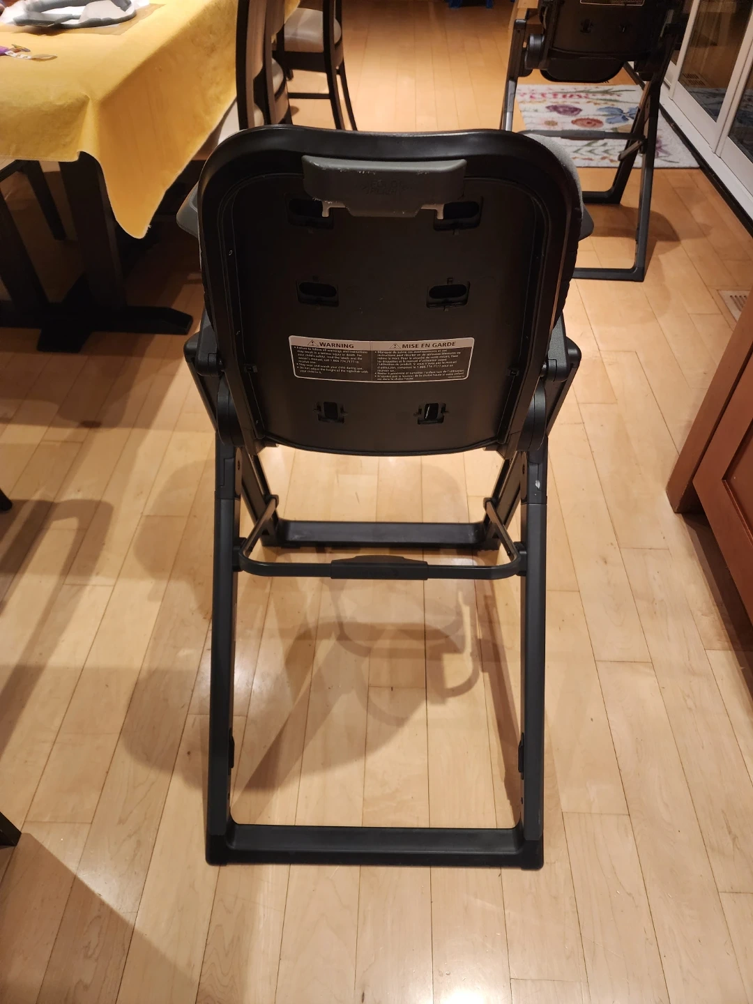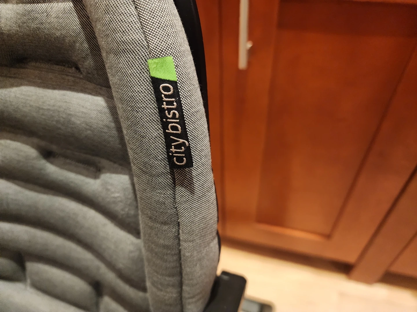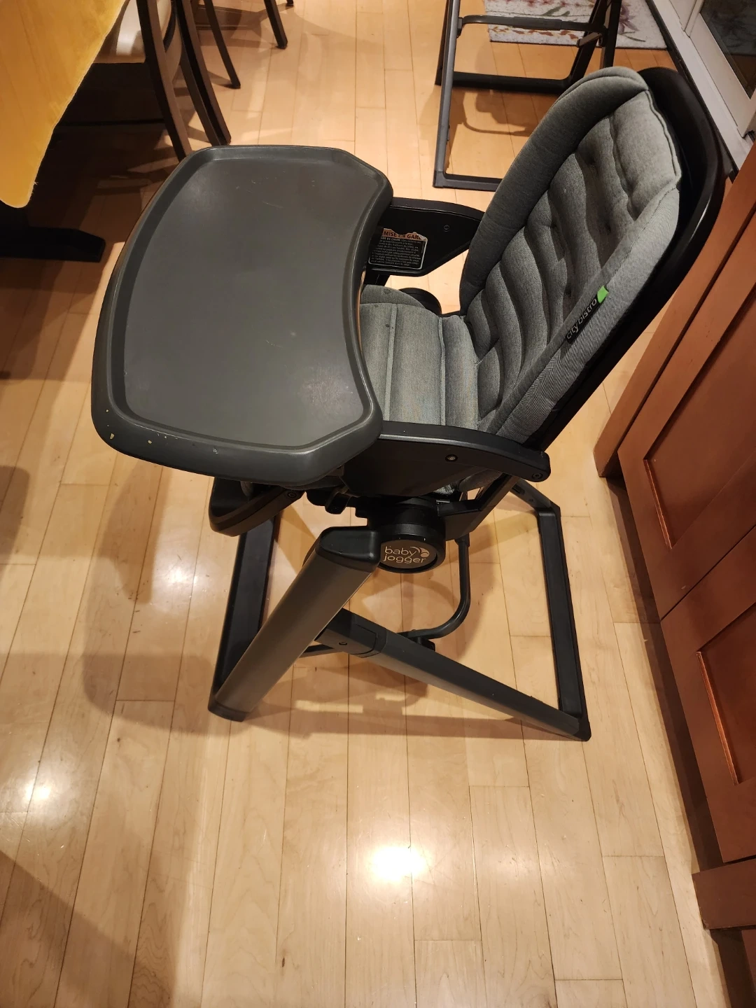This Baby Jogger City Bistro high chair comes in a grey fabric. It has a removable tray and a fold-up design for easy storage. Its sleek design makes it a great addition to any kitchen.
