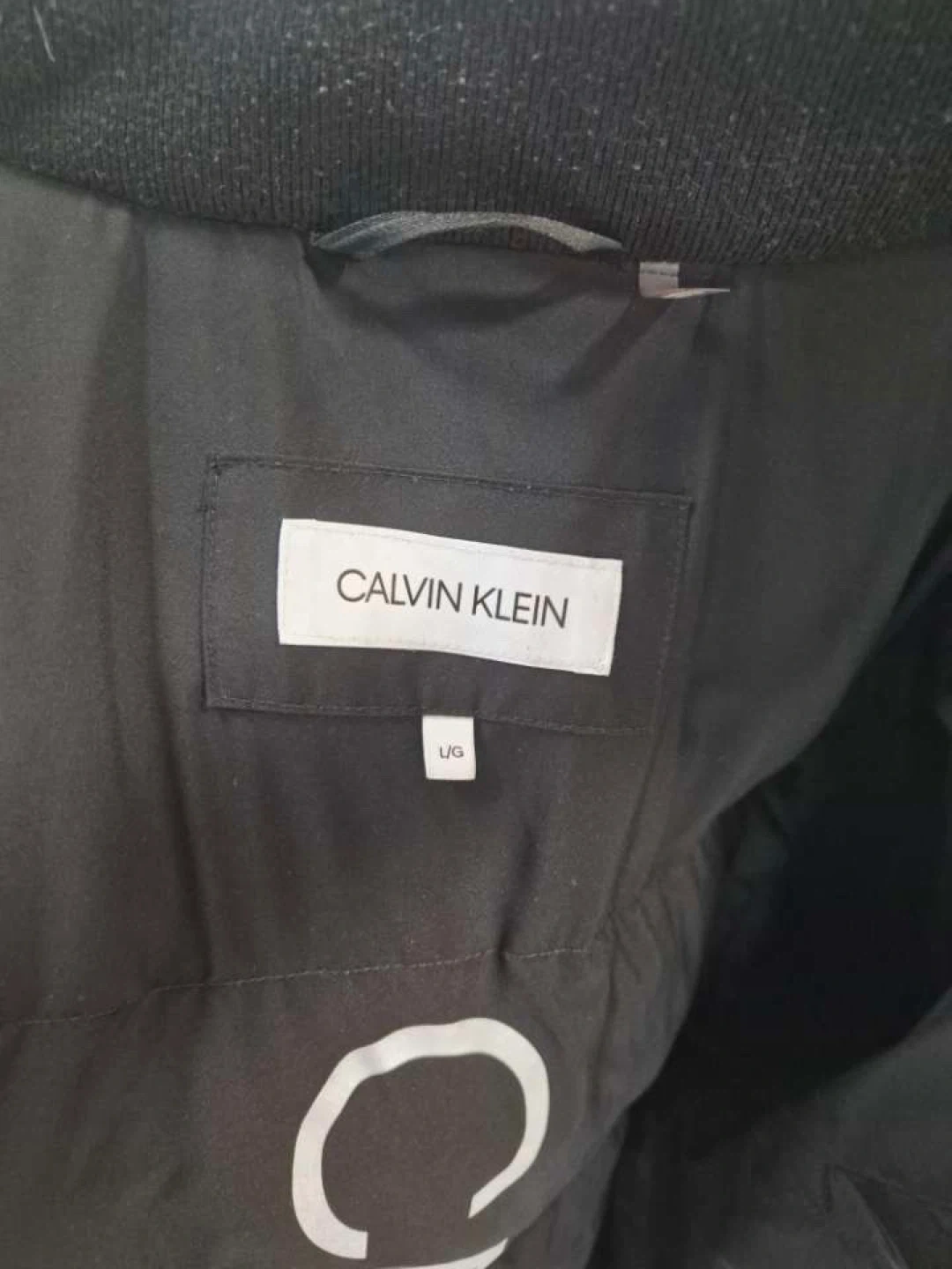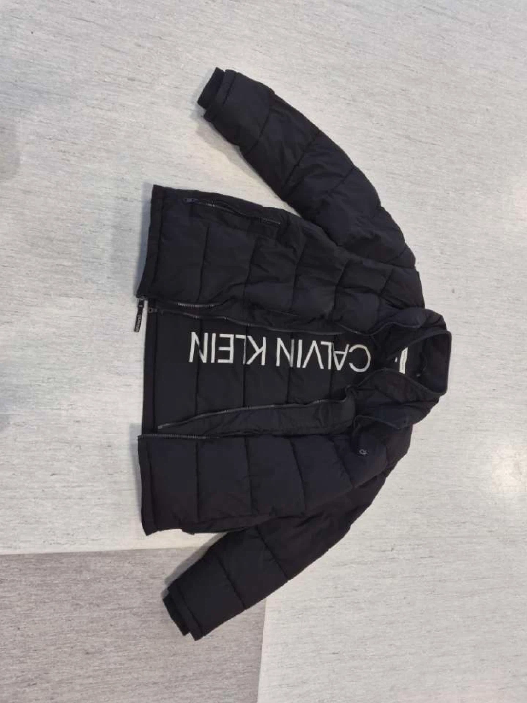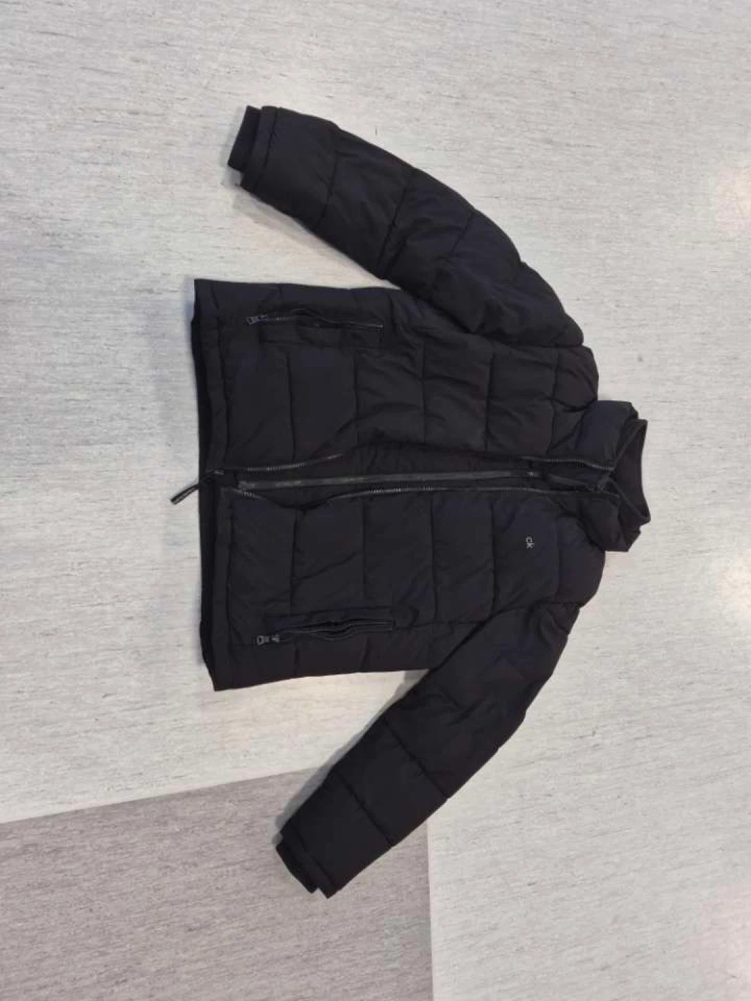 Calvin Klein puffer jacket in black. It's a size large with a zippered closure and pockets. This jacket's got a comfortable, quilted design.