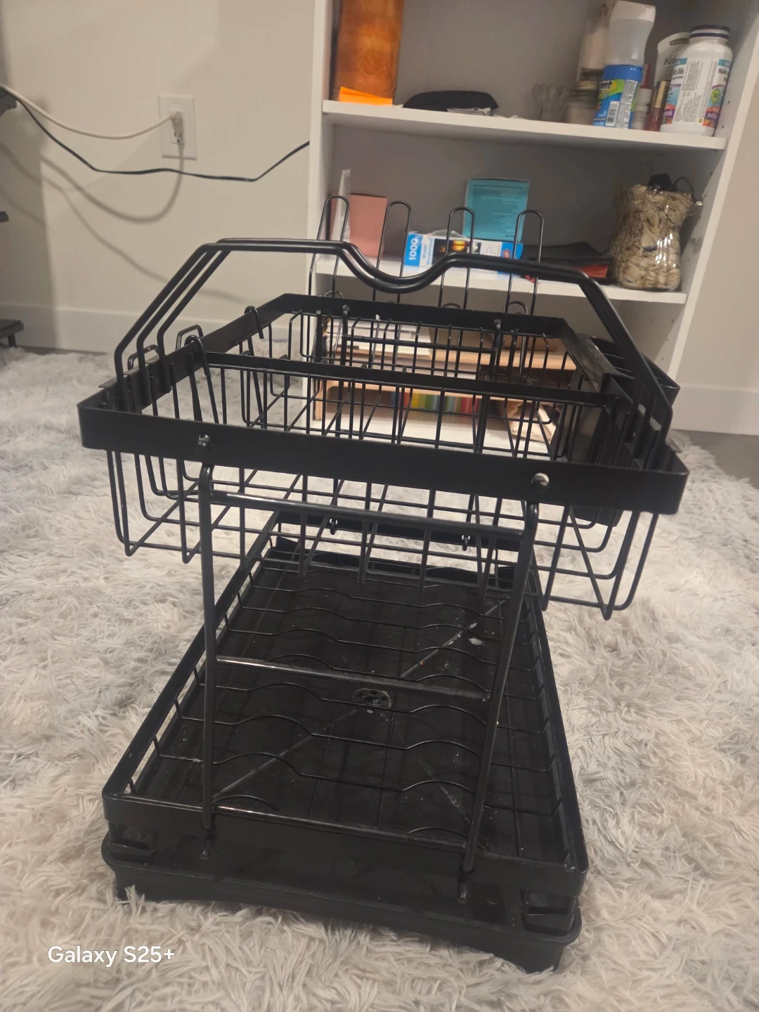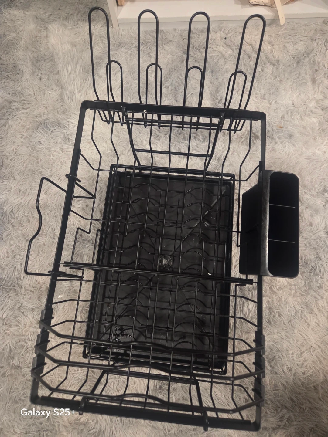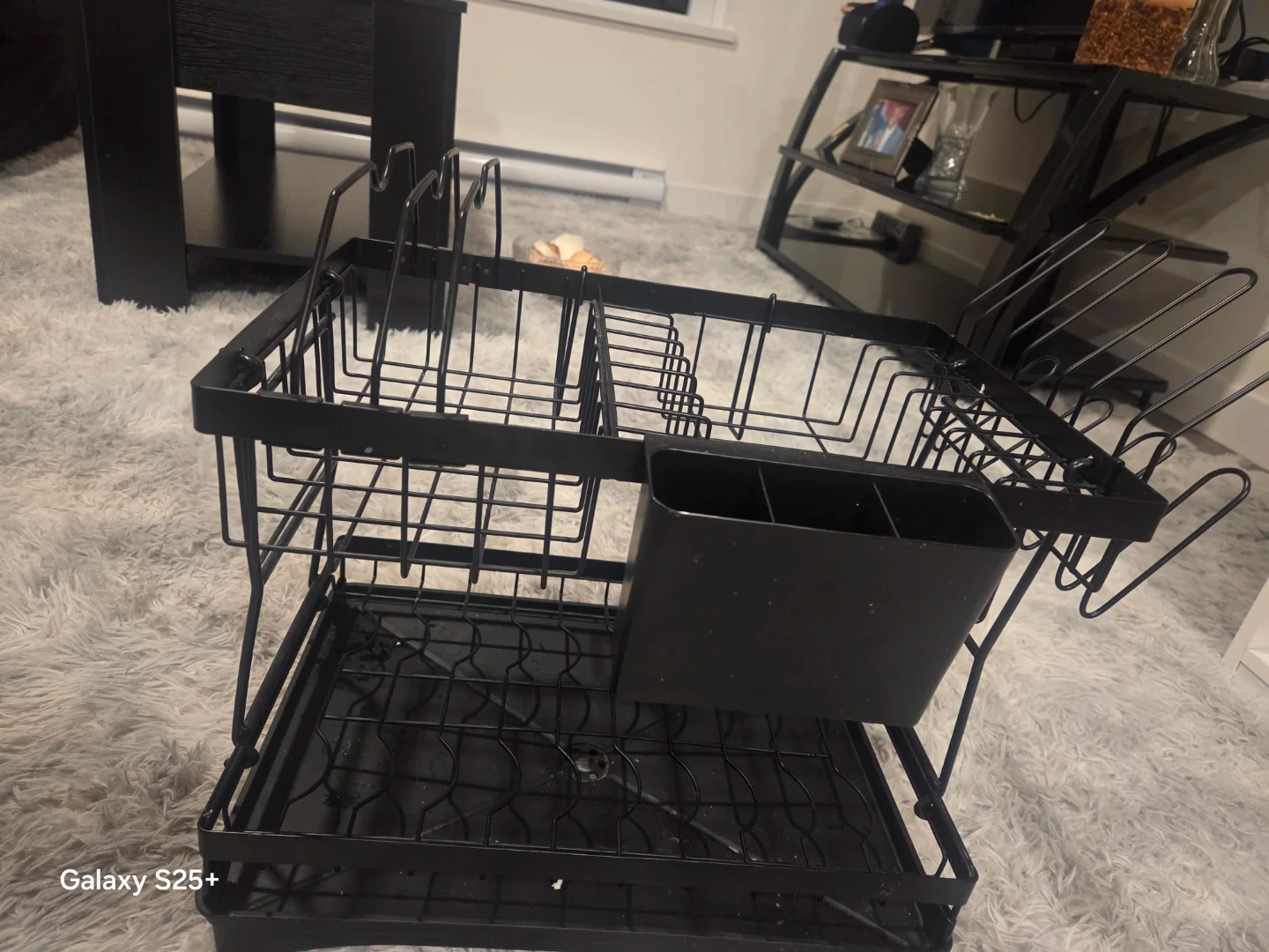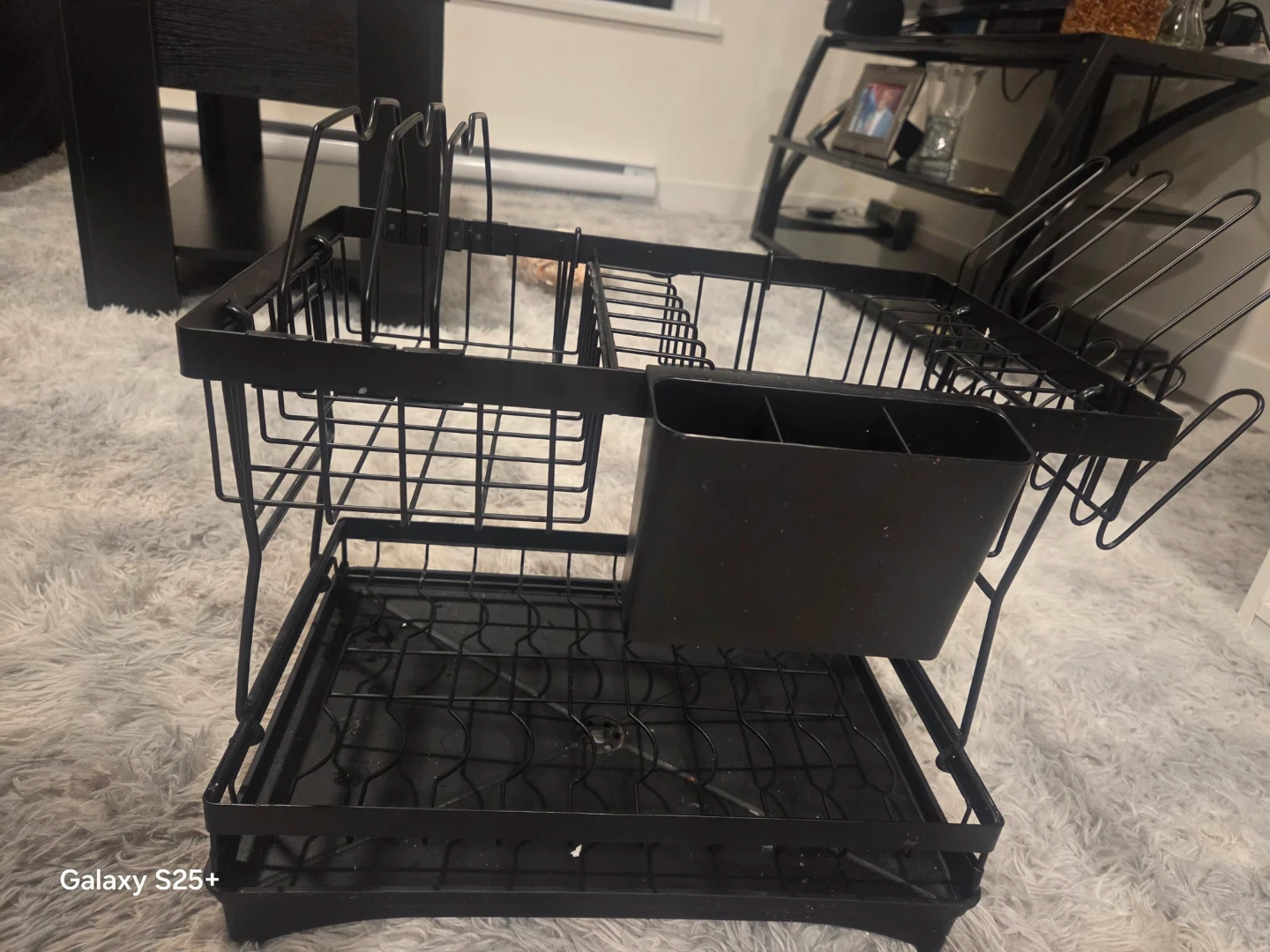 This is a two-tier dish drying rack with a black finish. It includes a removable utensil holder for convenient storage of cutlery. Its compact design makes it suitable for most kitchen countertops.