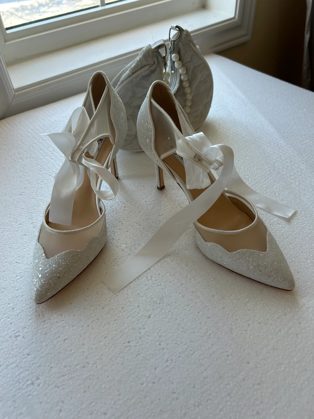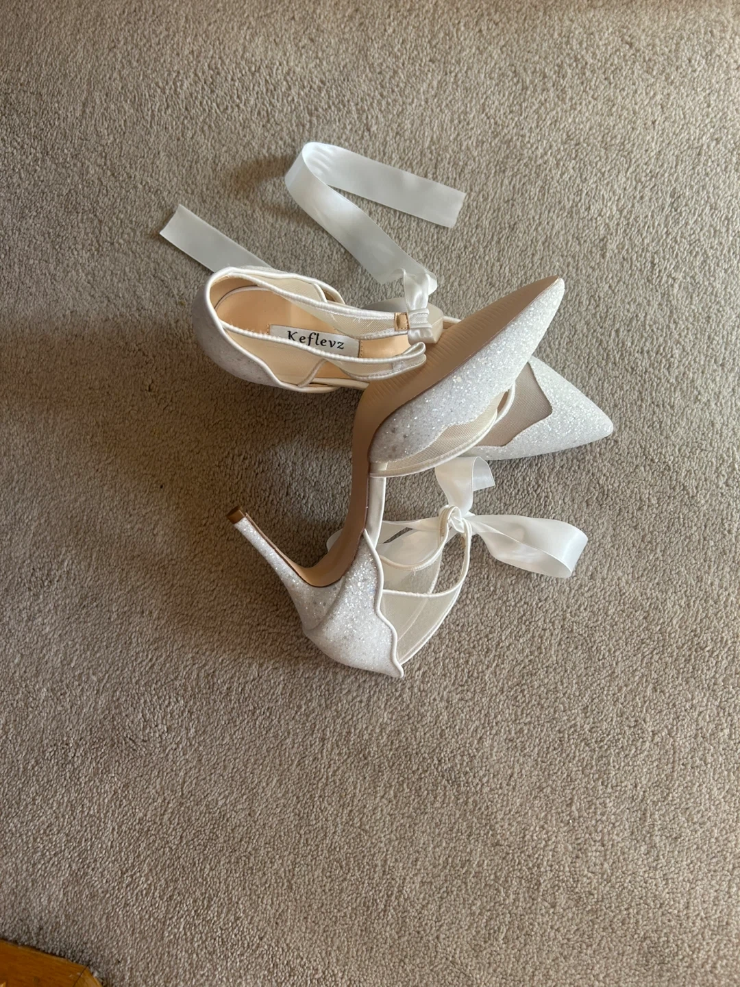 Elegant Keflevz heels in a sparkly white glitter finish. These shoes feature a delicate mesh overlay and a satin ribbon tie that wraps around the ankle. Perfect for weddings or special occasions!