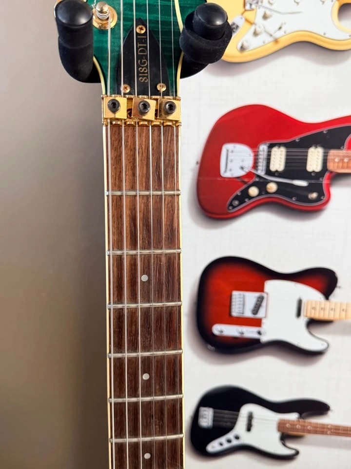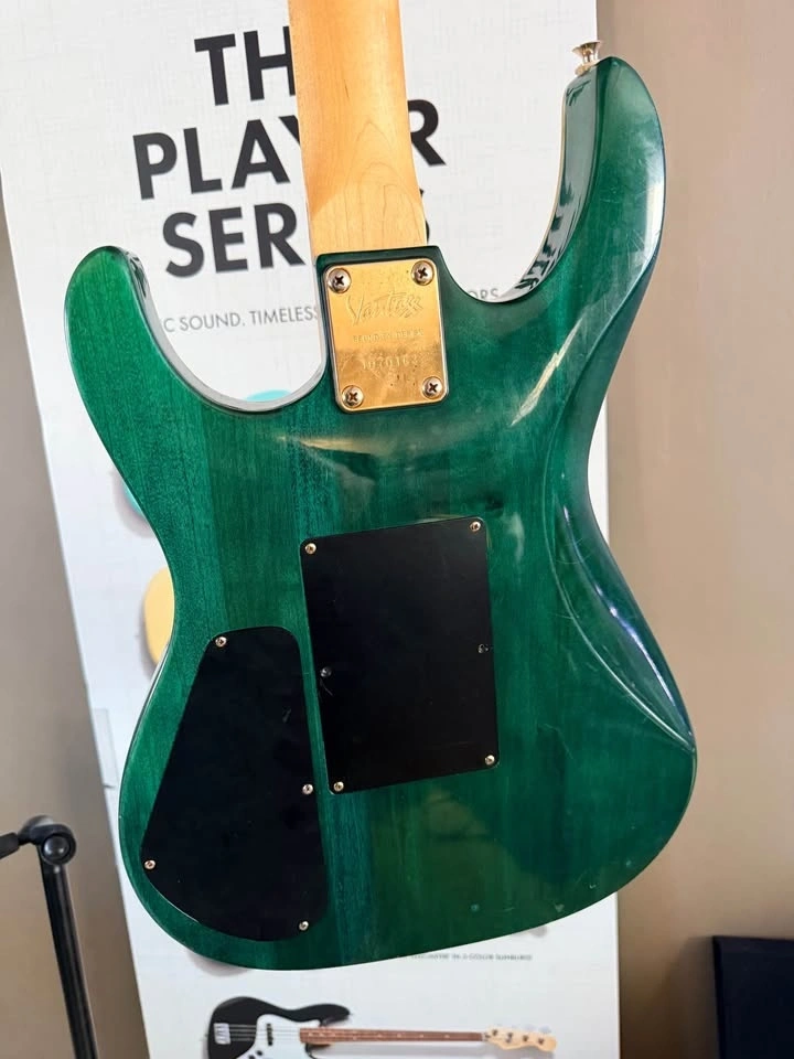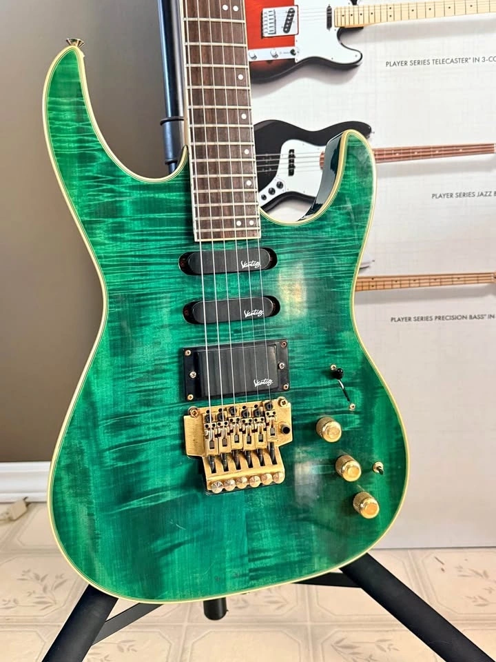This model delivers a classic super-strat feel with a comfortable neck, reliable hardware, and a versatile pickup layout suitable for everything from clean tones to rock and heavier styles. The translucent green finish over the flame top looks especially vibrant in person.