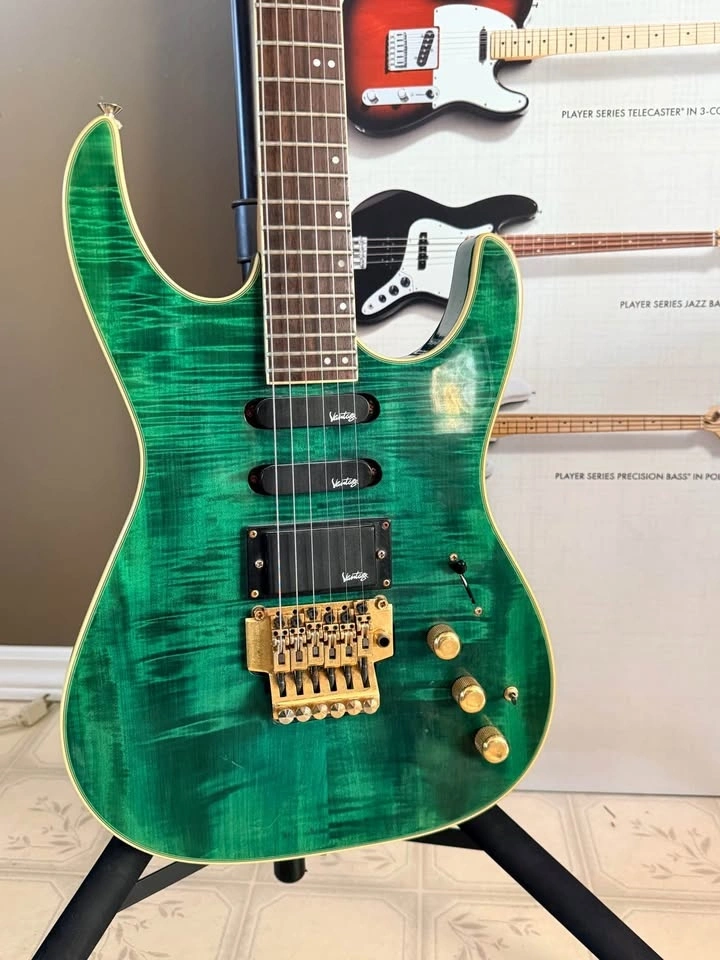 Vantage 818GDT electric guitar from the early 1990s, finished in a stunning Transparent Green flame top. These guitars were handcrafted in Korea during a period when Vantage was producing very solid, well-built instruments with excellent attention to detail.