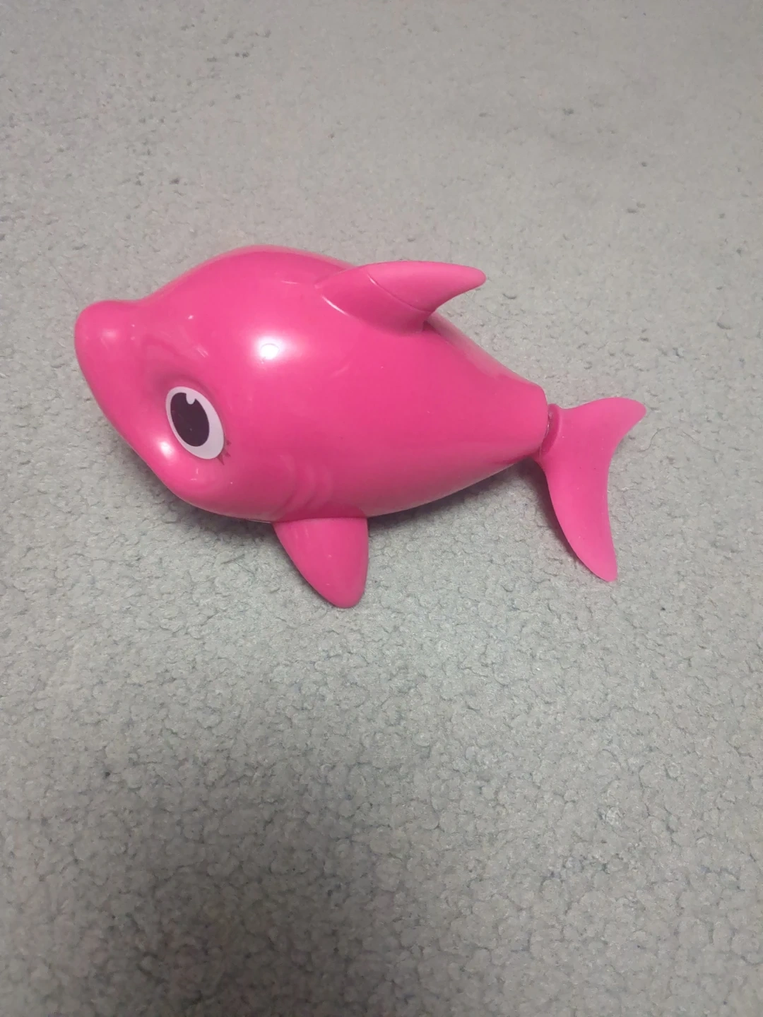 This pink shark is a fun bath toy for kids. It's made of durable plastic and designed to float. It's great for bath time entertainment!