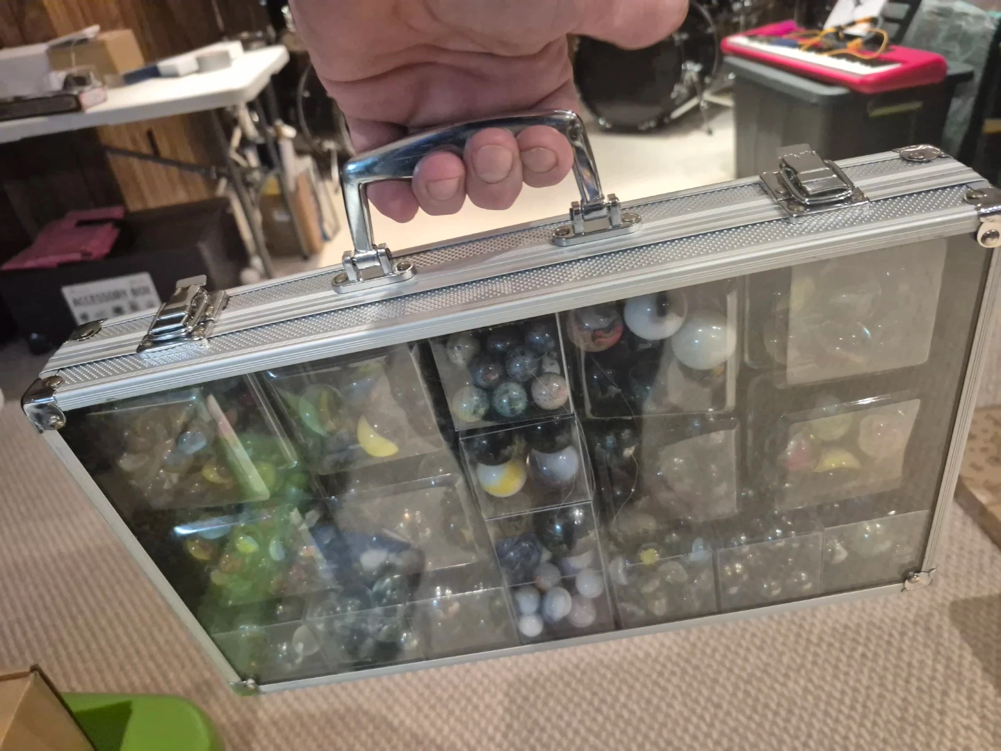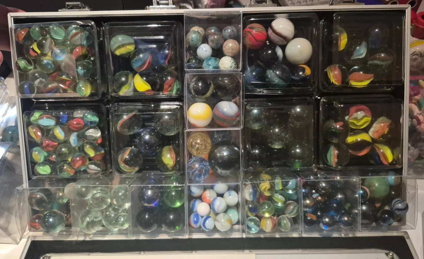 ​This isn't just a bag of marbles; it is a meticulously curated and hand-sorted archive of vintage and modern glass. Every piece has been organized by vane count, size, and manufacturer style to provide an "instant collection" that delivers on every level. The Player Inventory (Approx. 200 Total) ​The High-Volume Backbone: Includes two dedicated boxes of 40 marbles each specifically for sorted 3 and 4-vane varieties. ​seven additional compartments house a diverse mix of player-sized marbles, including premium 5 and 6-vane rarities. ​Style & Texture Spectrum: A complete range featuring vibrant "Clearies," ethereal "Foggies" (Cloudy Master Glass), and bold Mexican (Vacor) swirls. ​Vane Variations: categorized by internal petals and rare external surface ribbons. ​The Shooter Gallery: From Players to the "Mega Shooter" ​A Ladder of Sizes: nearly 2 dozen 5 and 6-vane shooters in various sizes, scaling from standard 5/8" players to large display pieces. ​The Crown Jewel: Features one Giant "Mega Shooter" that serves as the definitive centerpiece of the entire collection.