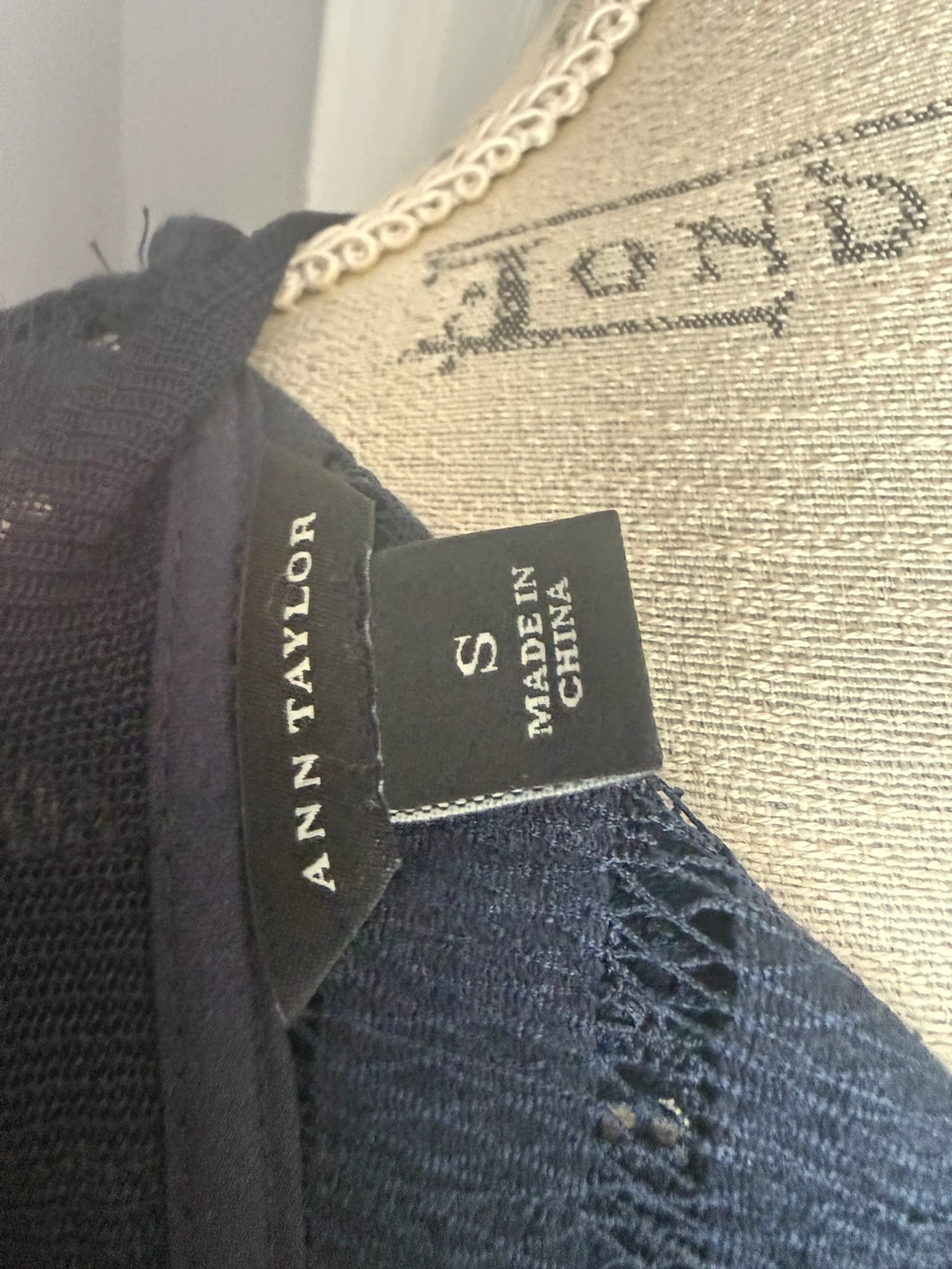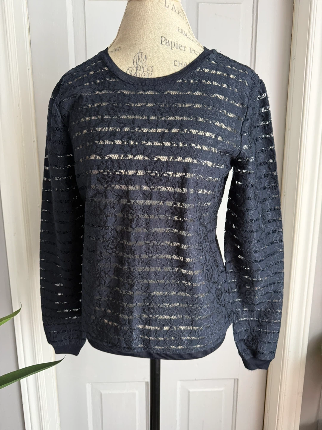 Ann Taylor navy blue long sleeve top with a delicate lace overlay. It's a size small. This top is made from a sheer lace material with horizontal stripes.