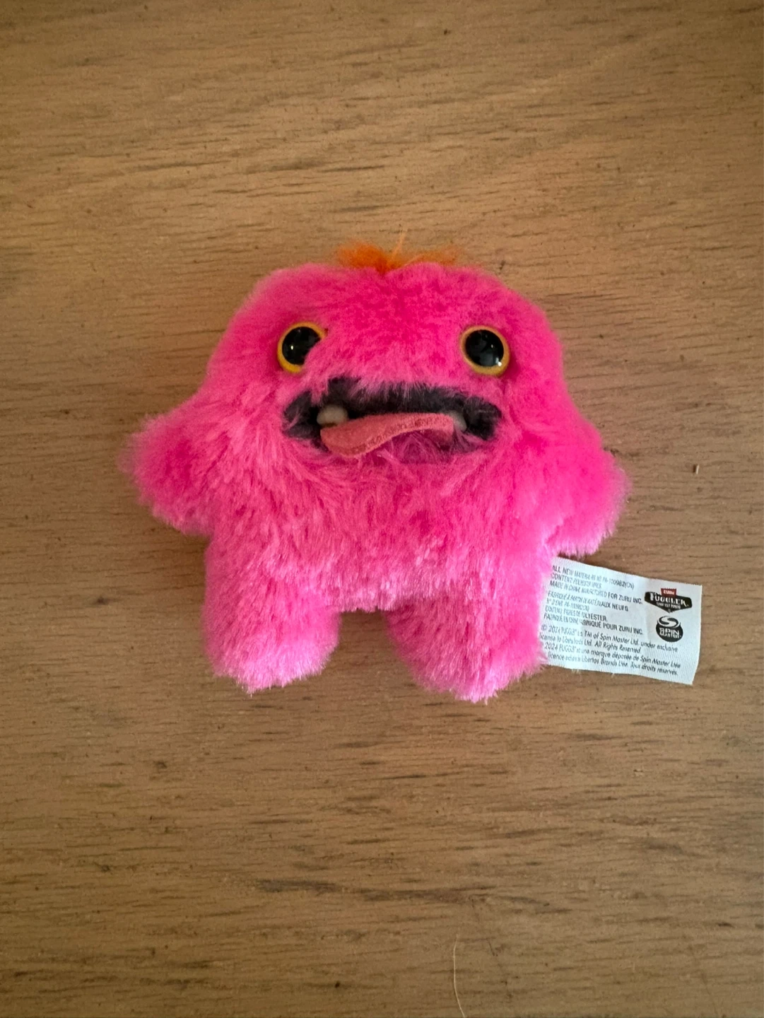 This is a fuzzy pink plush monster toy from Fugglers. It has googly eyes and a funny tongue sticking out! It's a small, squishy creature, perfect for collecting or playtime.
