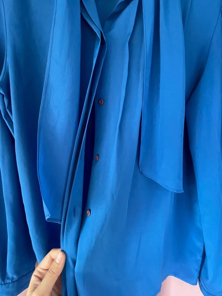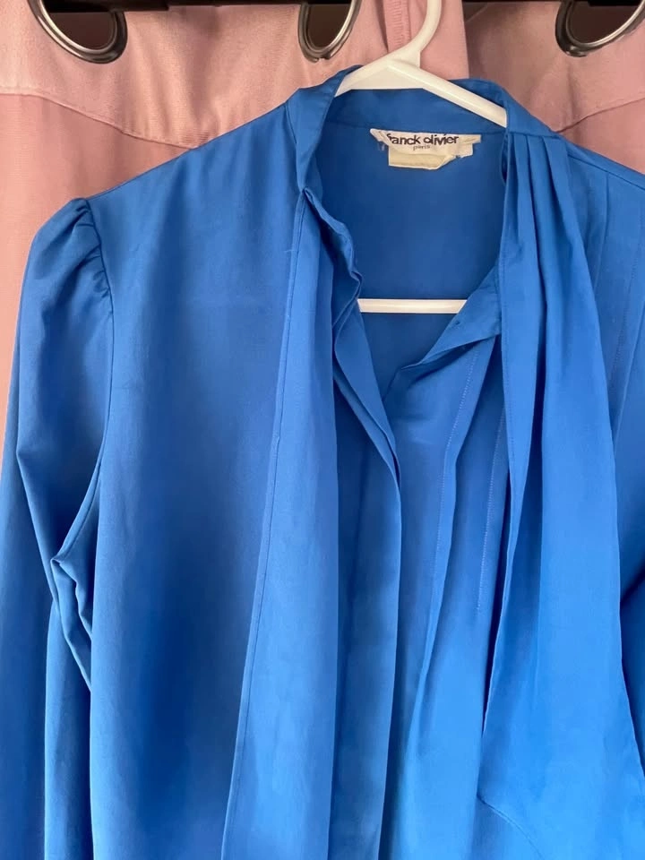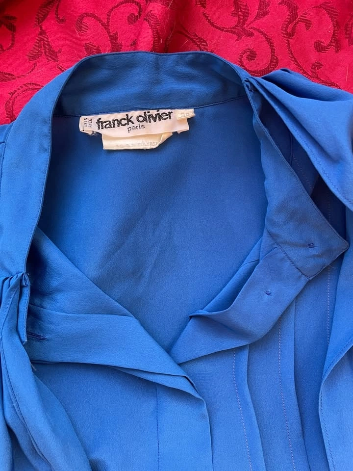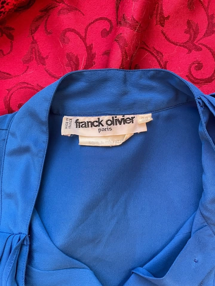 Vintage Franck Olivier Paris blouse, made in France. 100% polyester. Size S-M, chest laid flat measures 19 inches. chic tucked into skirts, pants etc and flowy