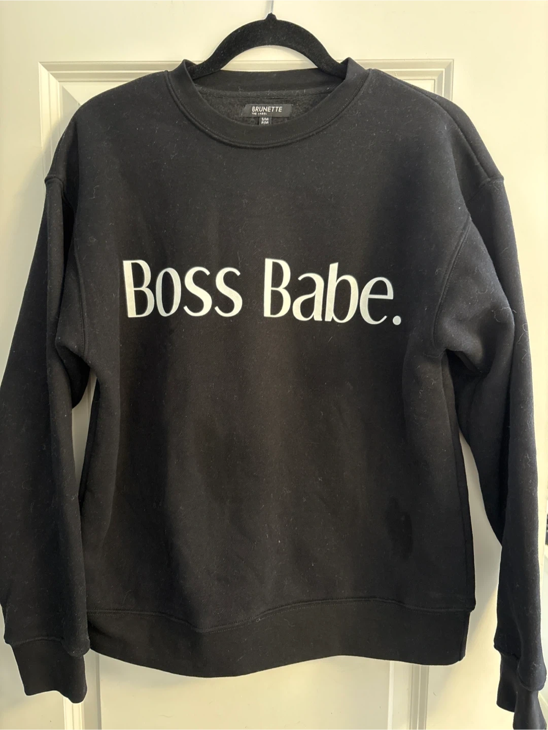 This is a black crewneck sweatshirt from Brunette The Label. It features the "Boss Babe." graphic on the front. Made in China. Size is S/M. Retails for $80.