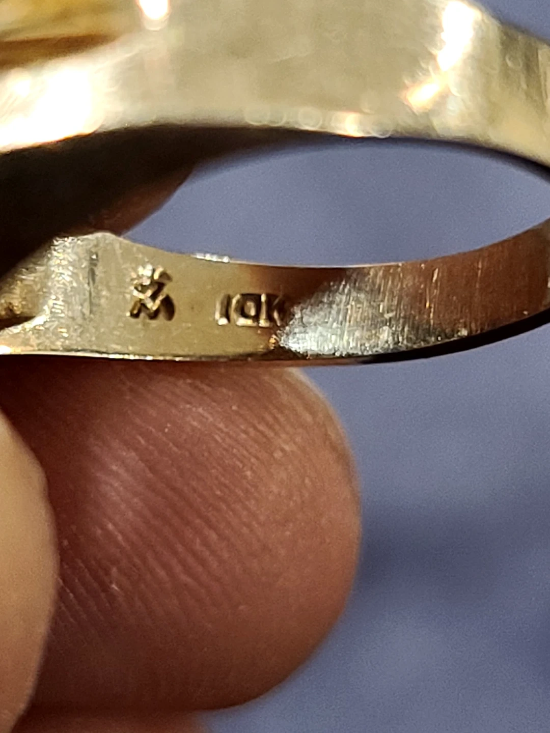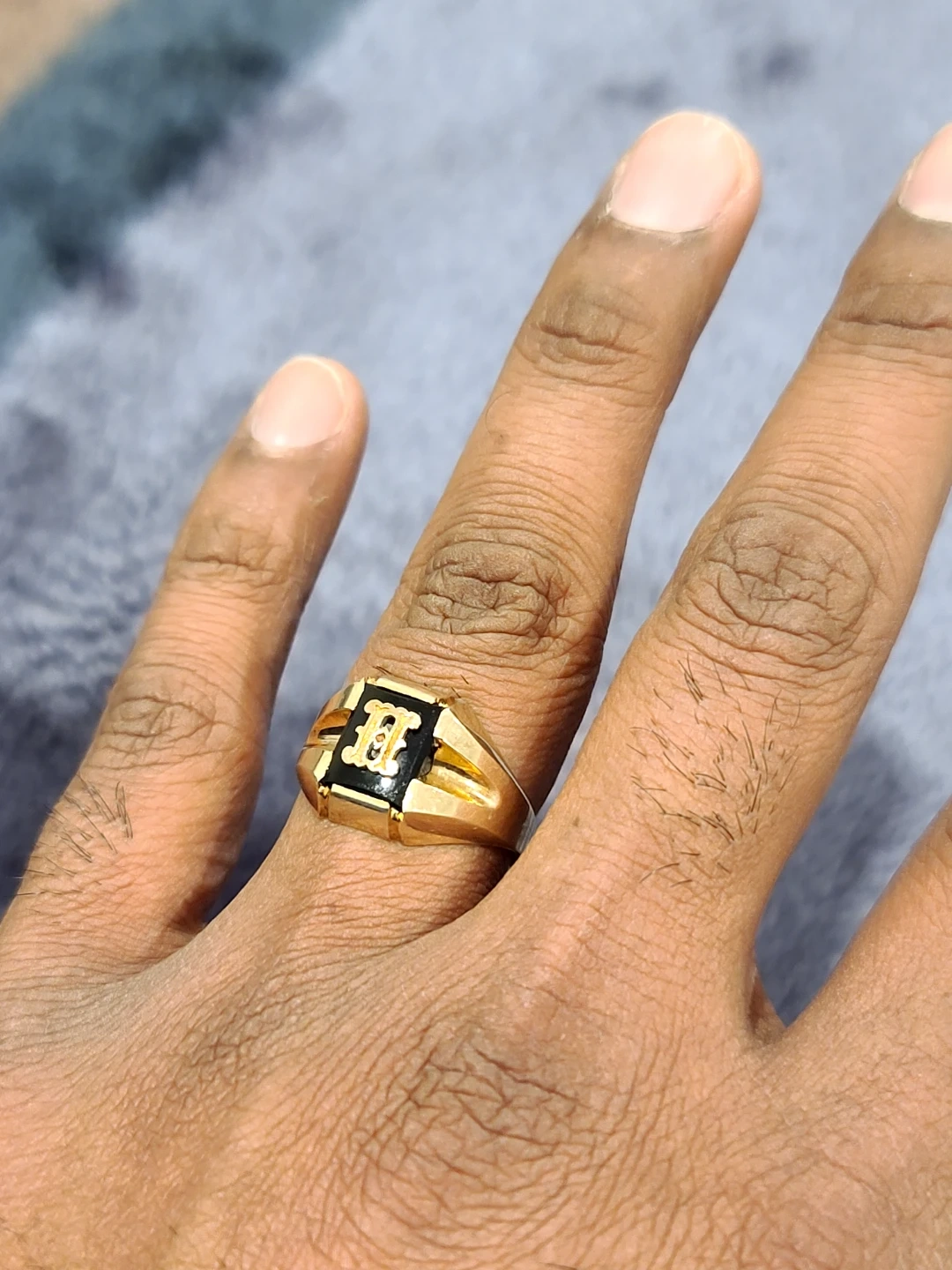 This is a 10K gold signet ring with a black inlay and an "H" initial. It weighs 3.4 grams. A classic piece for everyday wear.