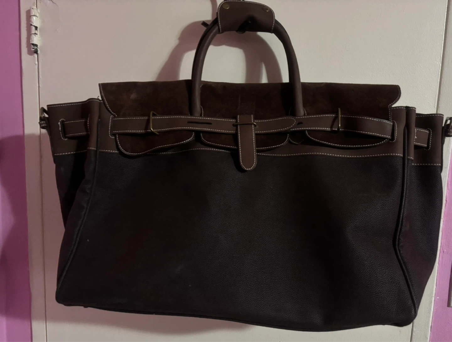 A spacious tote bag with a mix of pebbled leather and suede. It features classic buckle closures and sturdy top handles. This bag is perfect for travel or everyday use.