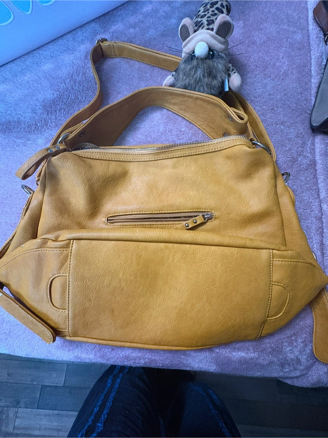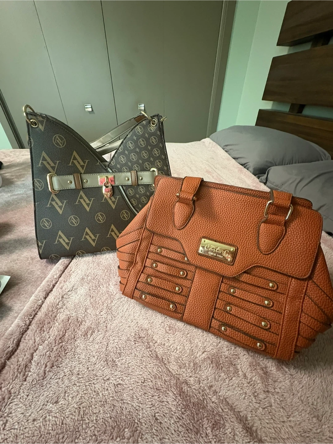 Four stylish women's handbags in various colours and designs. Includes one orange pebbled faux leather handbag with gold stud accents, one brown monogrammed hobo bag, a light blue tote with cut-out detailing, and a mustard yellow shoulder bag. Great for everyday use or special occasions!