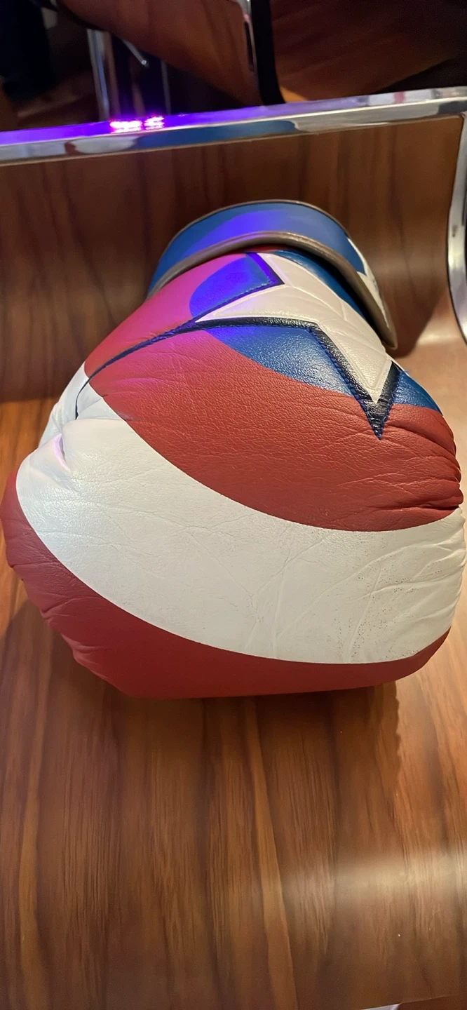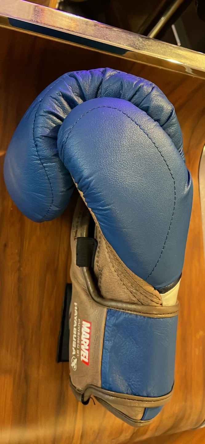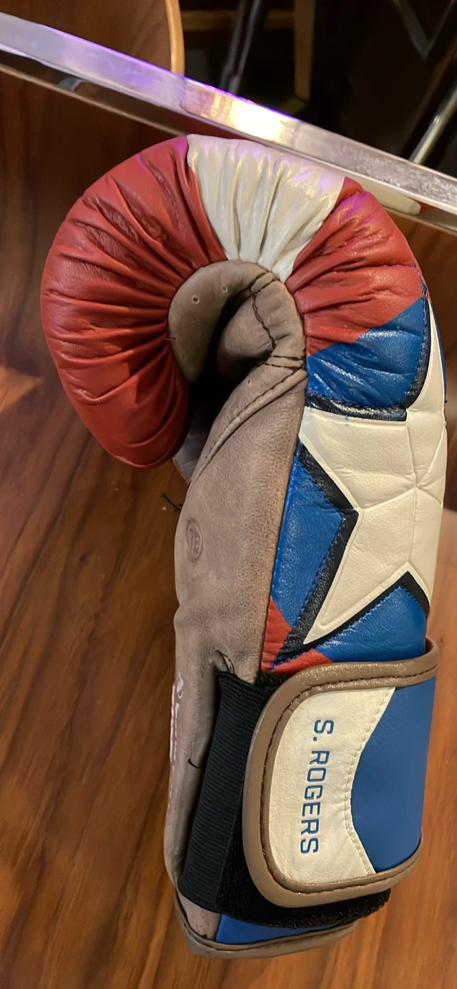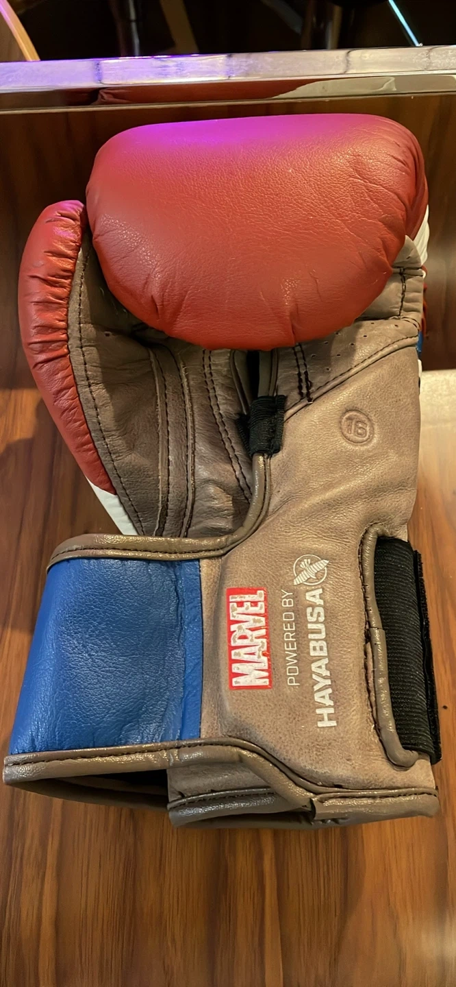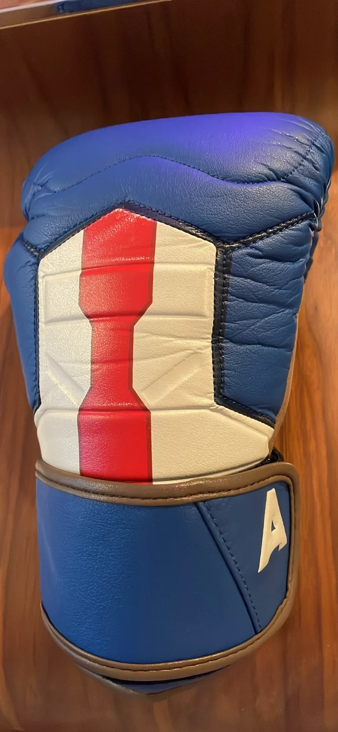 These Hayabusa boxing gloves are designed with Captain America's iconic look. They are branded "S. ROGERS" and feature the Marvel logo. Size 16oz.